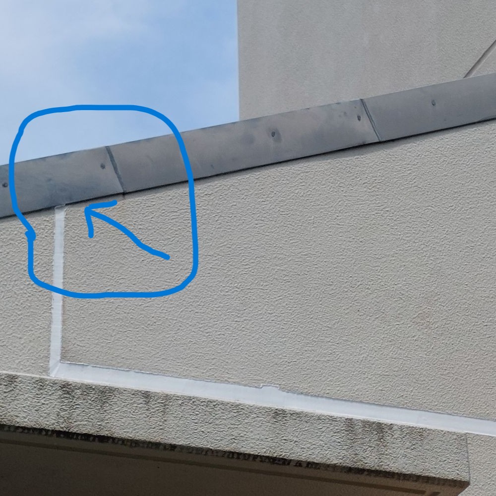 - マークしてる部位が屋根ケラバ板金ですが、補修前の写真では5枚に分割して施工されていますが、1枚物のケラバ板金を寸法を合わせて板金業者さんに製作してもらい、この板金の上に被せます。
