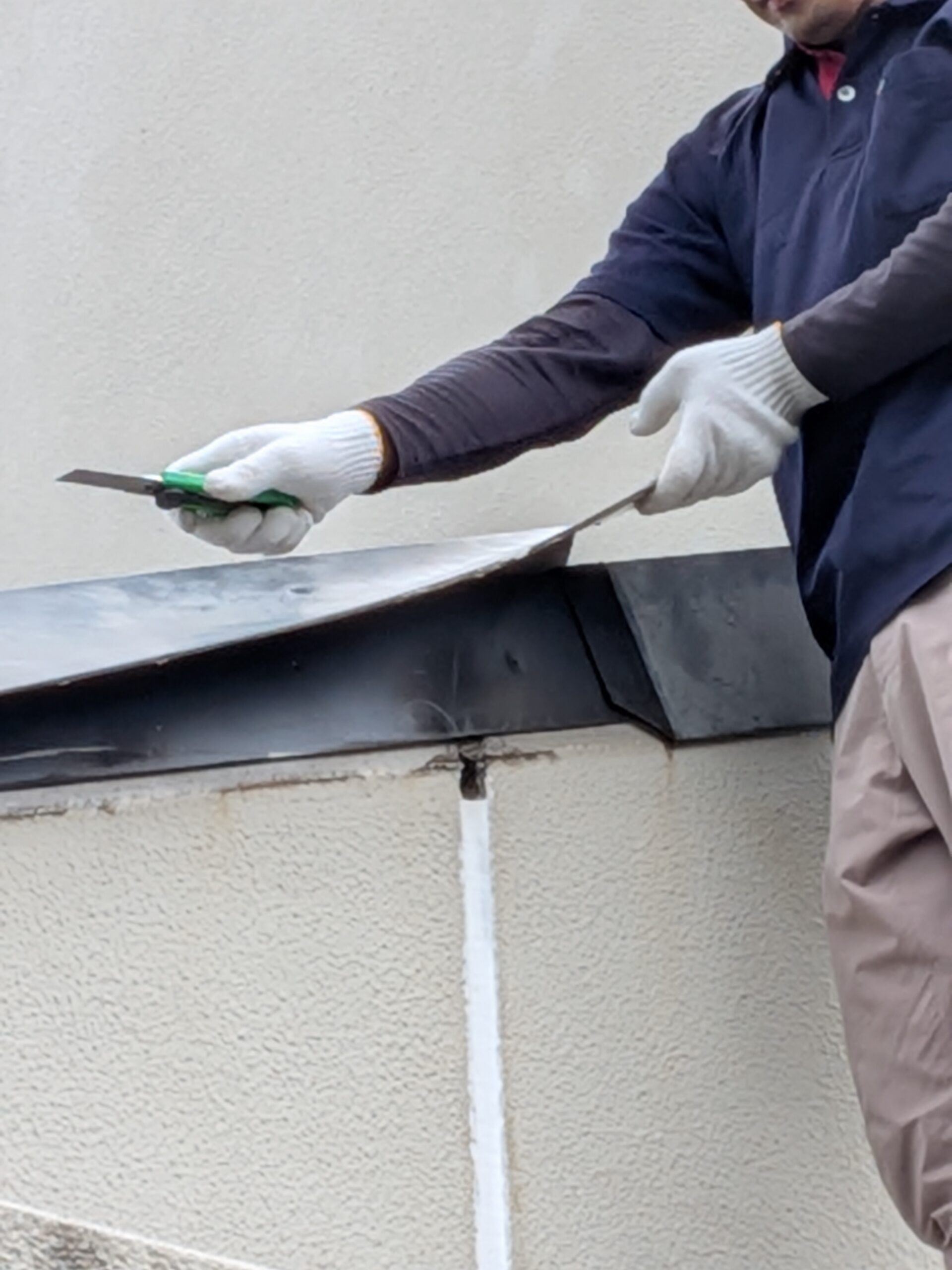 - 板金をめくってみたら、コーキング端部が切れていました。この場所から水が浸入していると思いますのでコーキングで端部処理をして穴を塞ぎました。最初のコーキング処理では板金の下の為処理が出来ませんでしたが、当日は板金業者さんも現場に待機していまして、コーキング処理の後に板金の補修工事を行いました。