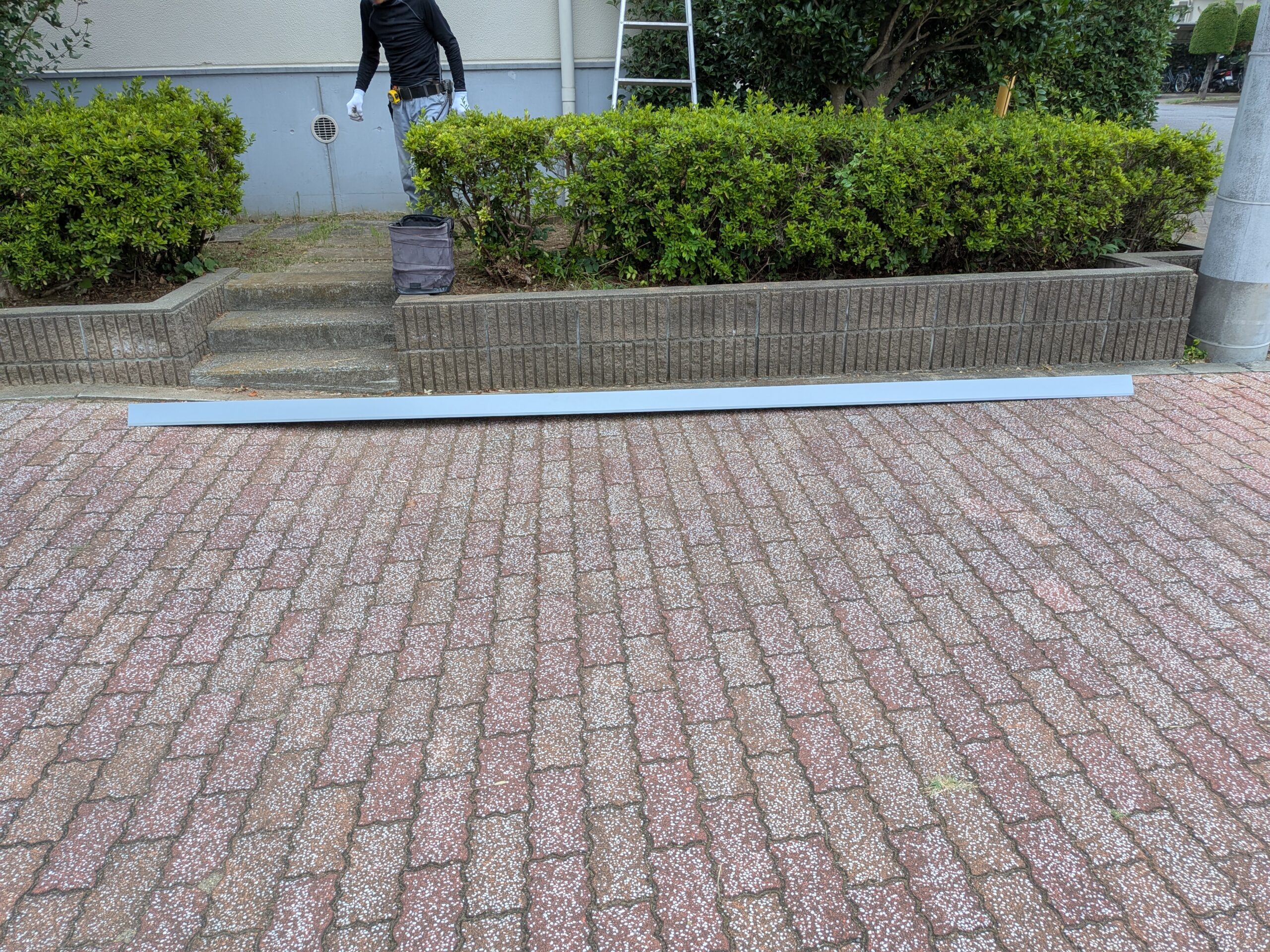 - 約4メートルのケラバ板金です。これを屋根の端部のケラバに樋付けます。やはり1枚物の板金が一番いいです。(これ以上長くなると加工機械の都合,製作は無理との事です。)