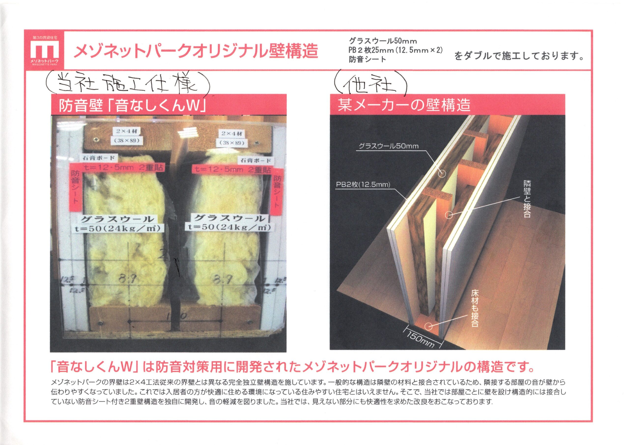 - 部屋ごとに土台と壁が立ち上がり、壁の中には遮音用の高密度の断熱材が入り、遮音シートと界壁用のボードが2重に貼られ、隣の部屋の音を遮断しています。