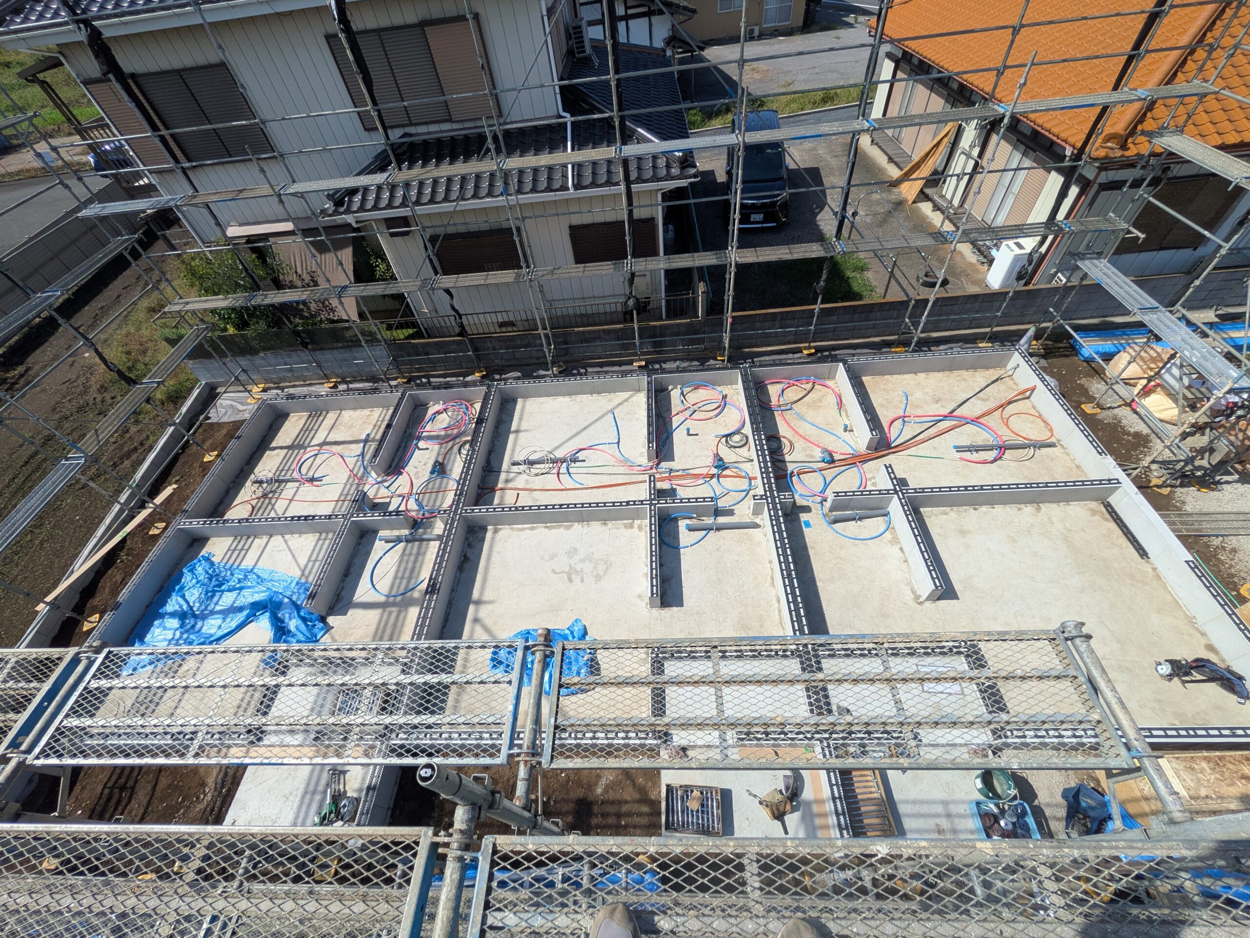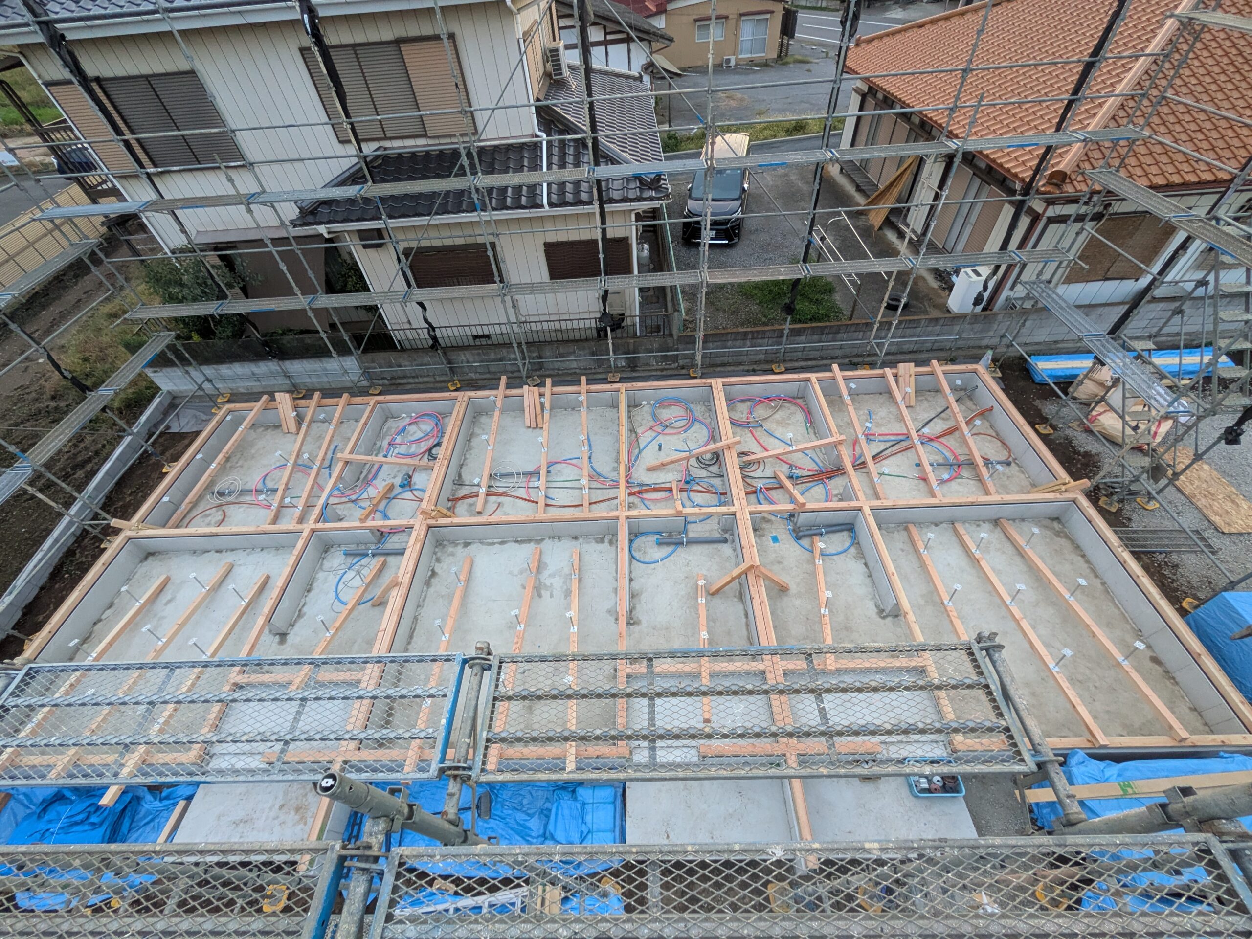 - これからは床下に90mmの高断熱の断熱材を引いて、その上に24㎜の構造用合板を貼って床下地を工事していきます。10月11日土曜日と14日にレッカー作業があります。そこで建物の輪郭が出来上がっていきます。