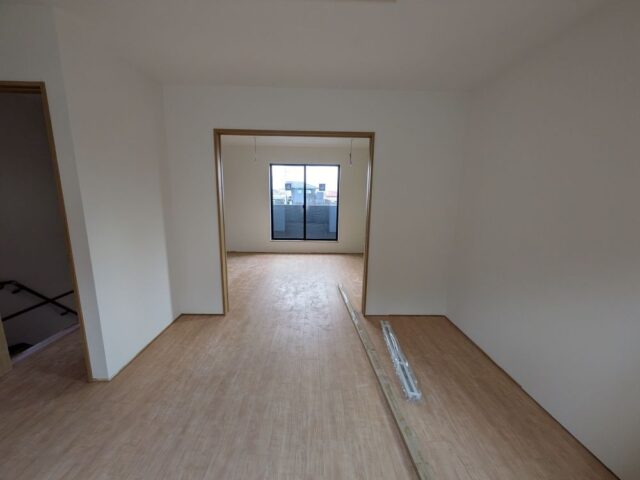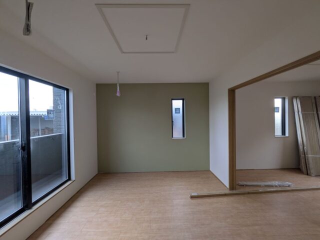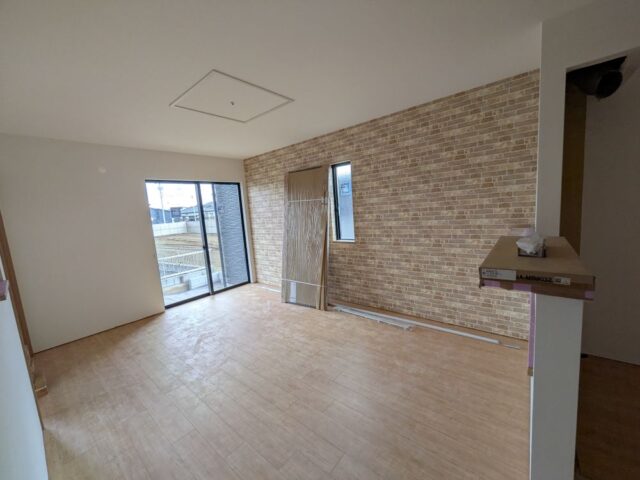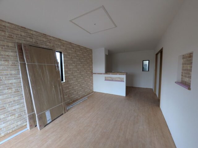 - クロス工事が完了しました。リビングです。立てかけてあるドアはこれから取付していきます。エアコンはこれから設置します。エアコン付きのLDKです。これからキッチン取付工事をします。