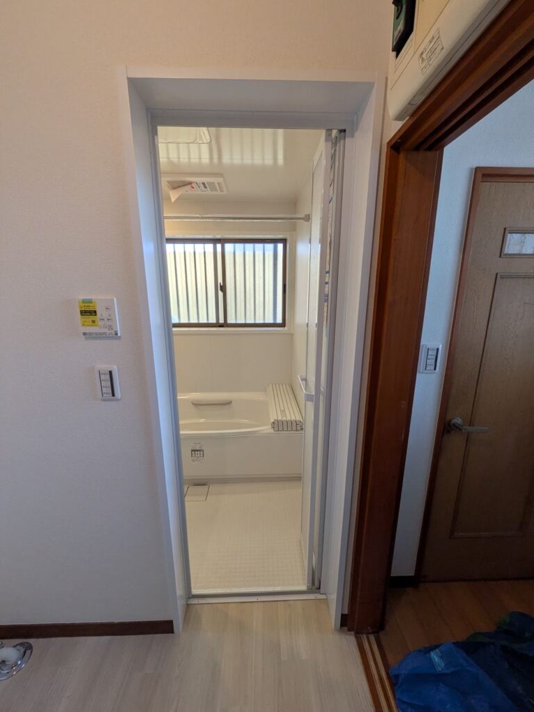- 交換後の浴室ドアです。内部と脱衣所の床の段差が無くなりバリアフリーとなりました。床のクッションフロアー・壁のクロスも張替えました。