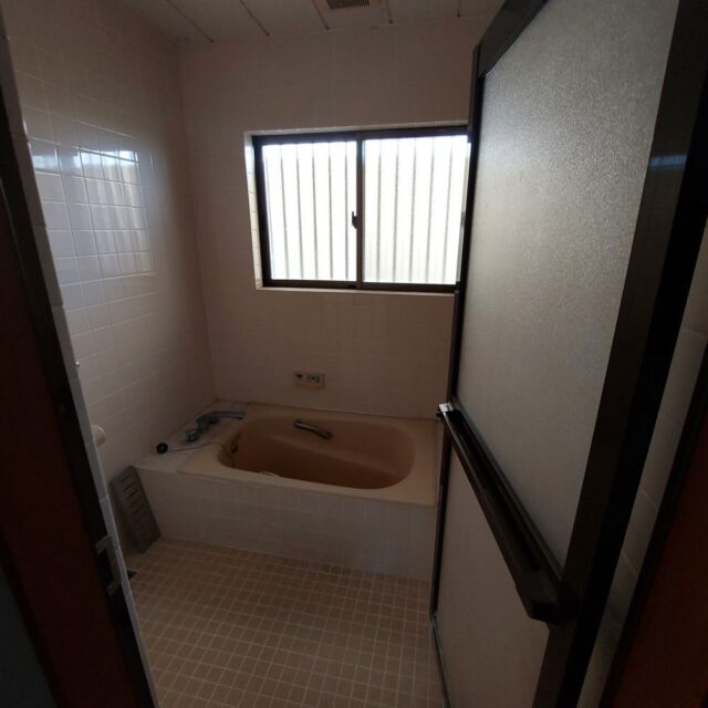 - 工事前の浴室状況写真です。床・壁・浴槽などタイル張りの浴室を同じ広さの畳2畳分のユニットバスに交換します。