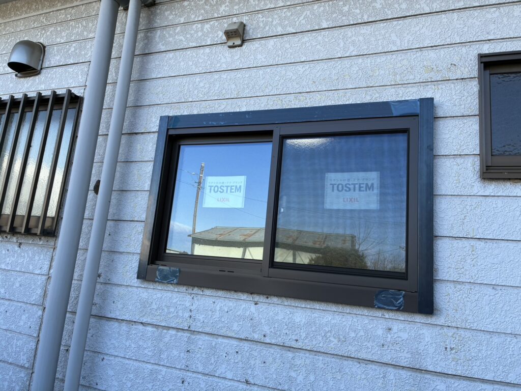 - 割れてしまったガラス箇所を内側から塞いで応急処置をしていました。面格子も付いてなかったので、今回の工事で設置予定です。