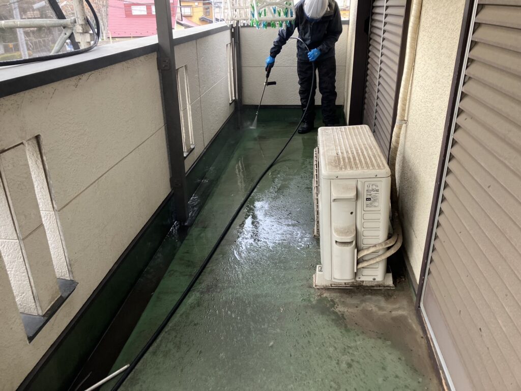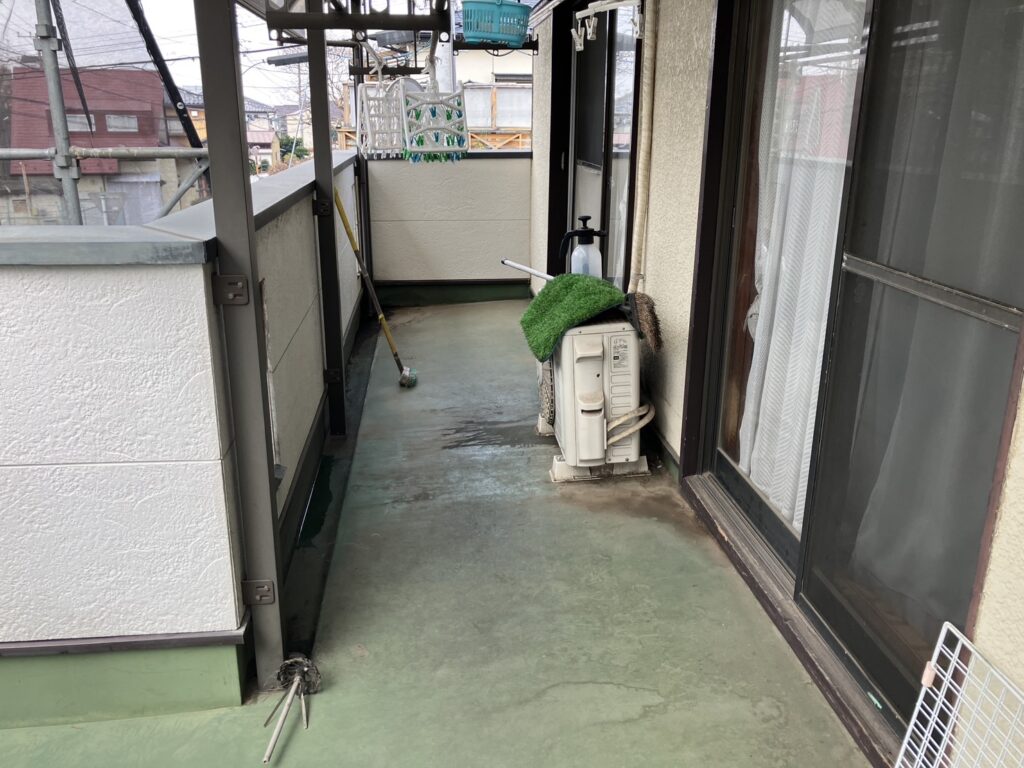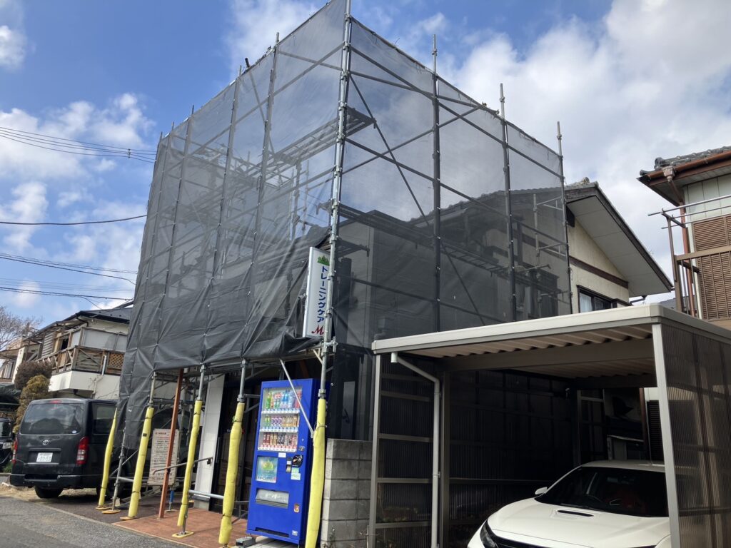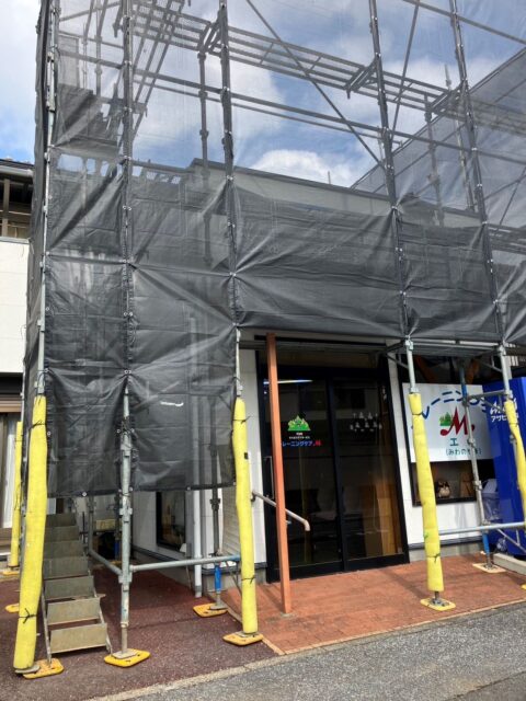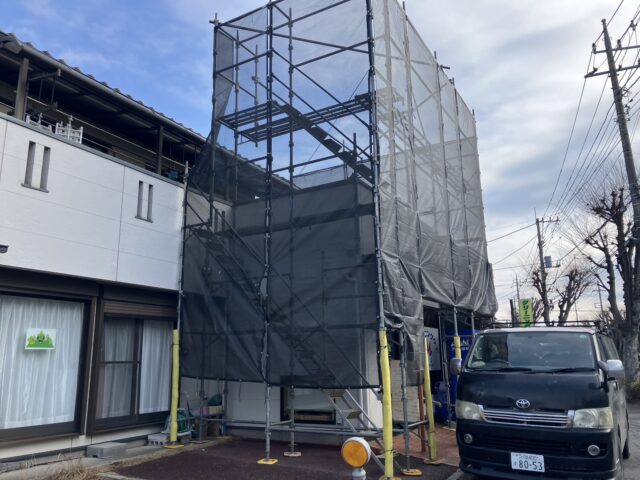 東側足場は隙間が狭いため、単管にて足場を作っています。
