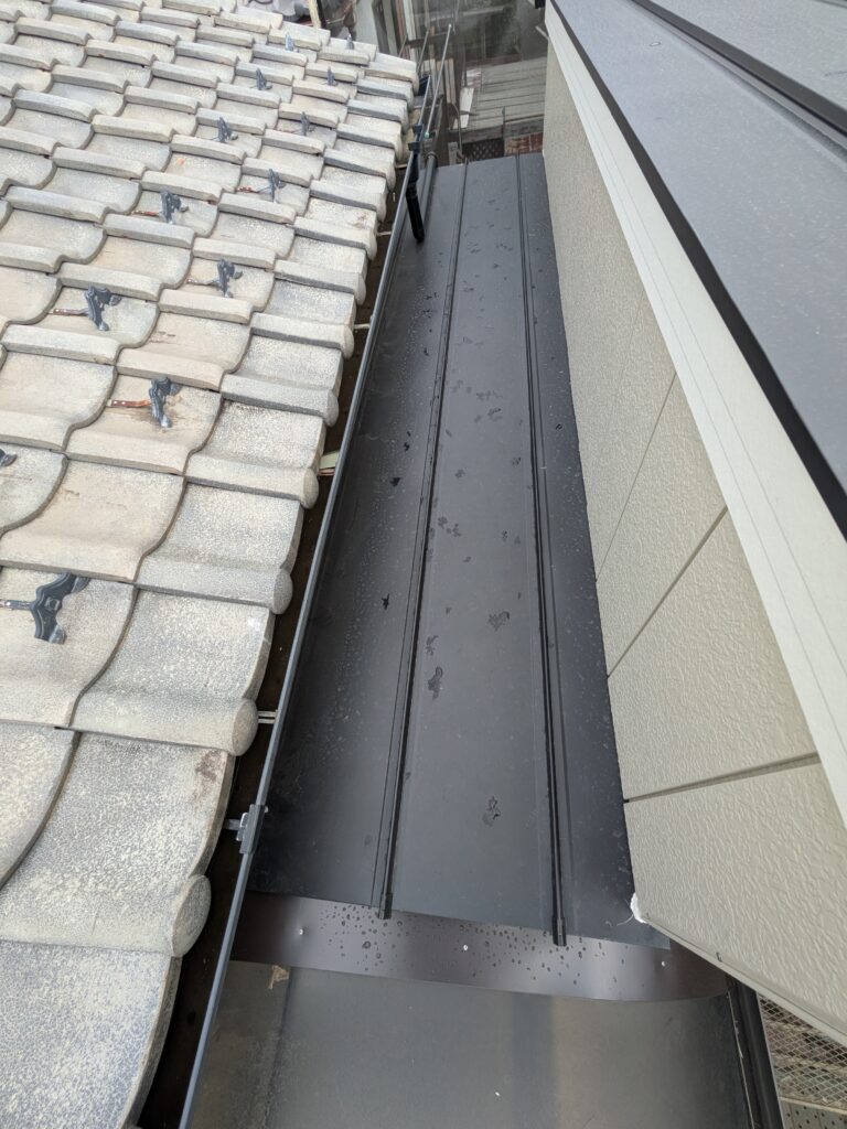 既存瓦屋根と増築部分との屋根取り合いです。軒下で仕上げた為。室内天井がその部分のみ下がり天井になってます。