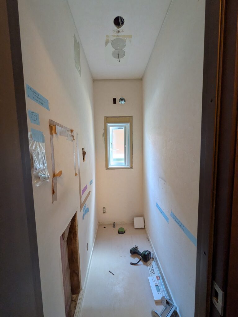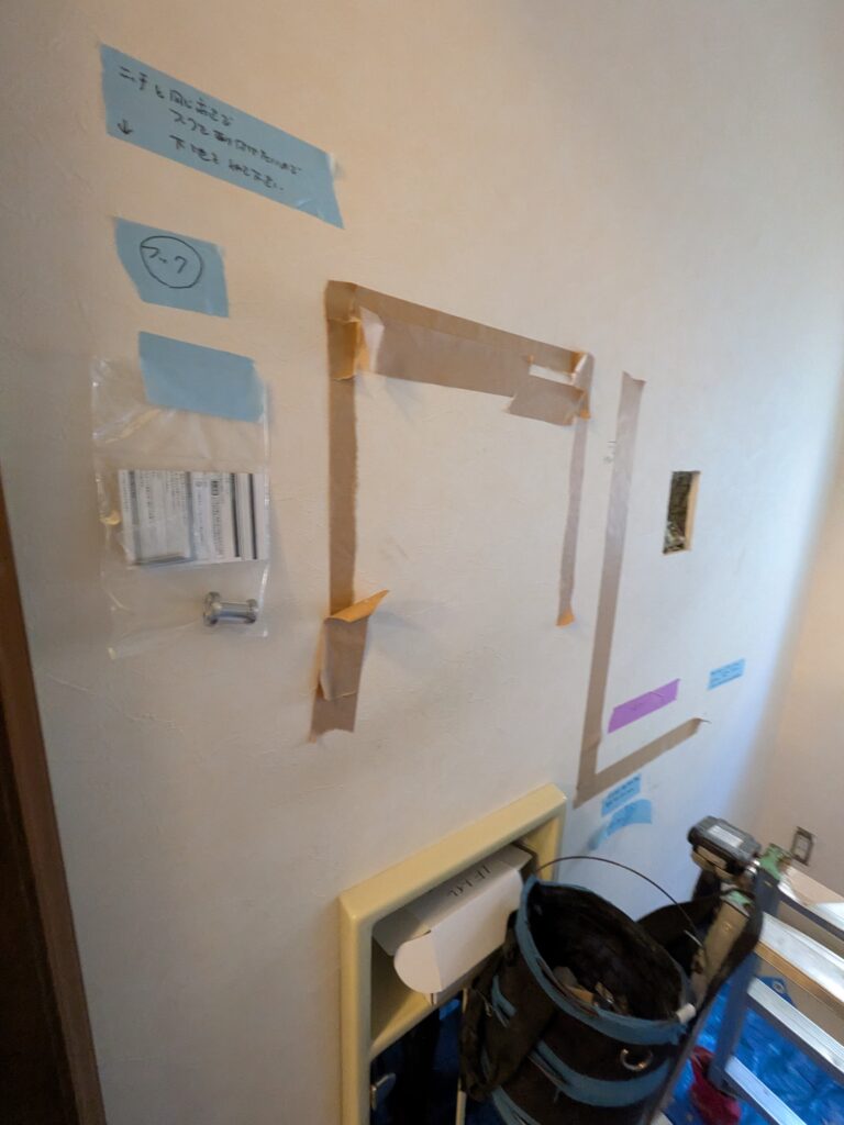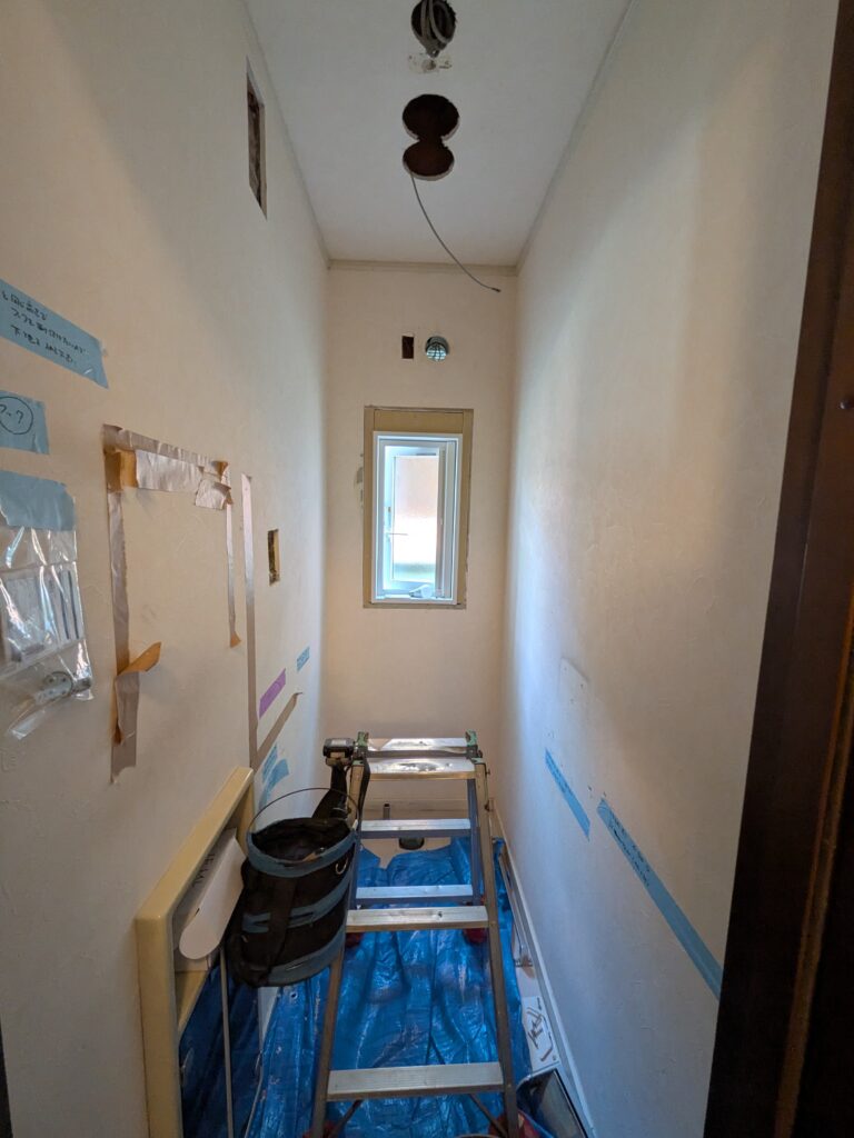 - 新しいい照明器具の位置やスイッチ位置の工事がおわり、下地ボードの補修をやりました。