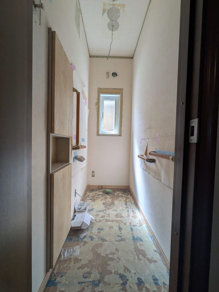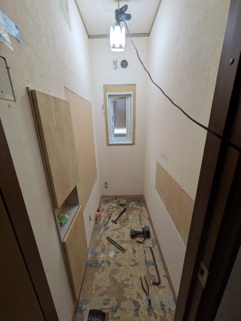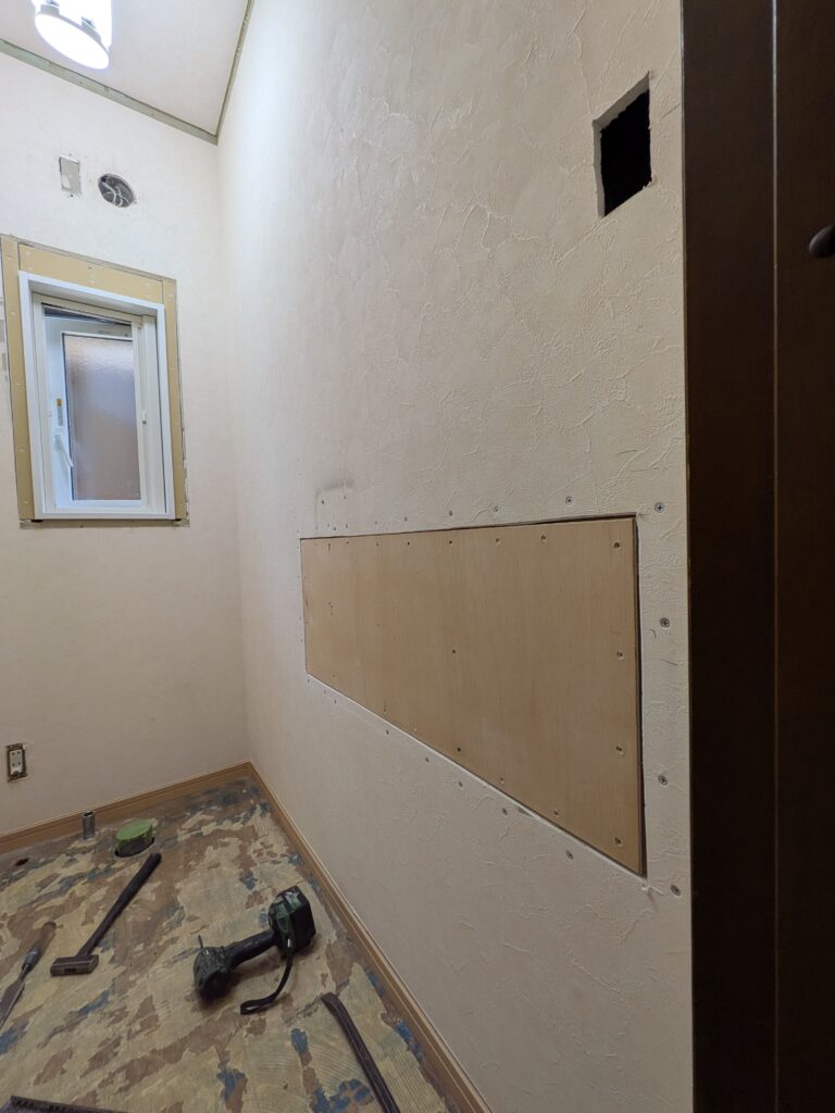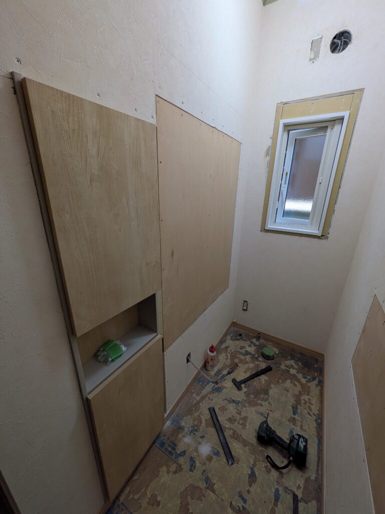 - 新しいい収納棚も付き、手すりも両側の壁につきますので補強で下地ベニヤを入れています。