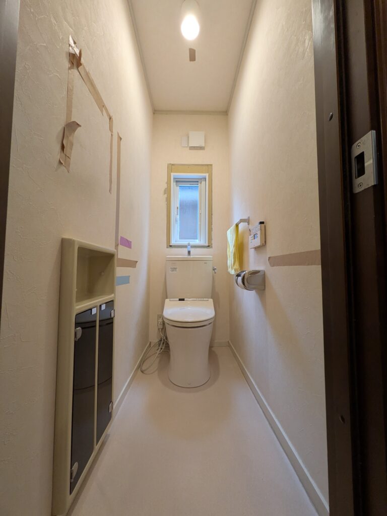 1階トイレ改修前状況です。床の貼替、壁・天井のクロス貼替・収納棚の交換