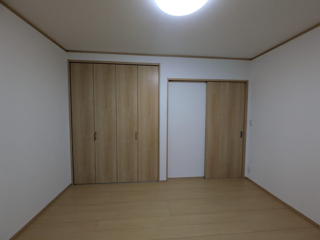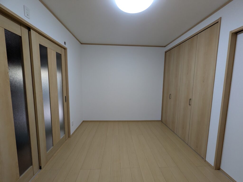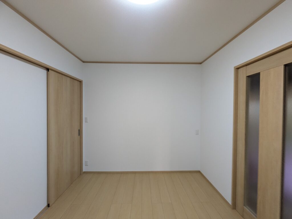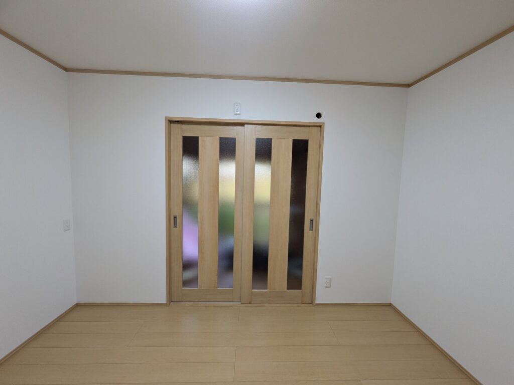 北側壁面の改修工事後の状況です。クローゼット扉は高さが2,300mmの大きい扉が付いています。引き違いの襖は片引き戸になってます。