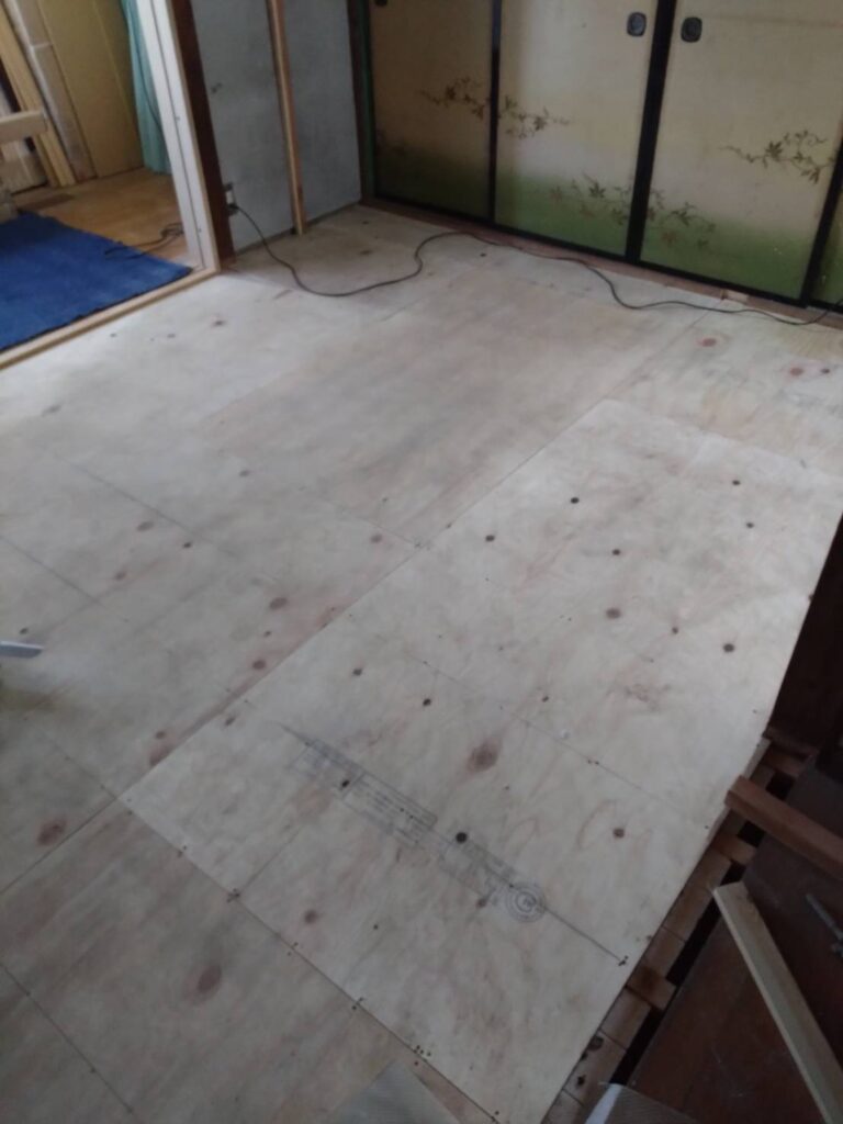 床下断熱材の上に下地ベニヤを敷いてから仕上げのフローリングを貼ります。奥に見える襖は撤去して壁を作ります。
