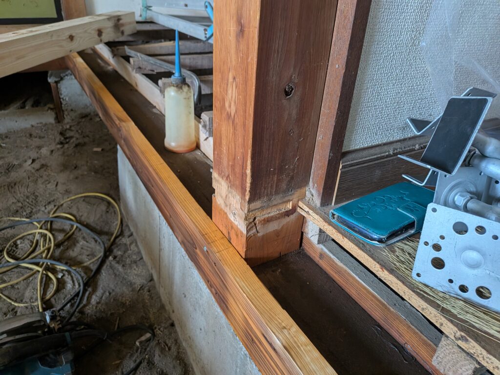 柱は白蟻の被害には合っていませんでした。柱の根元と新規の材木にも薬剤を塗っています。