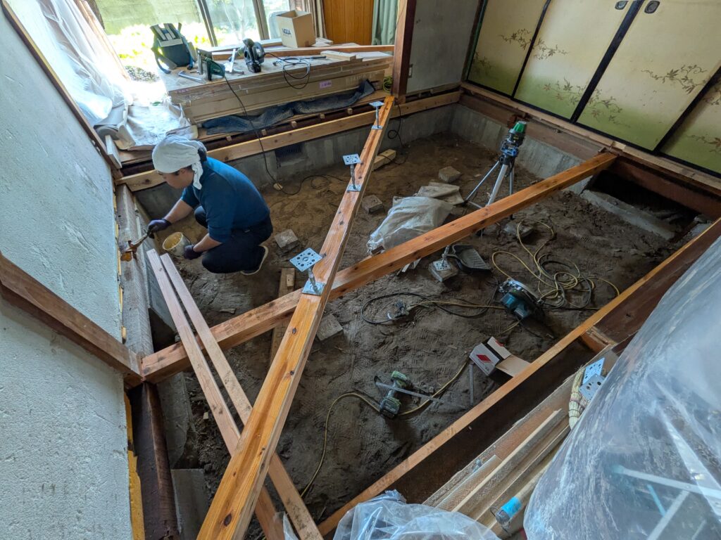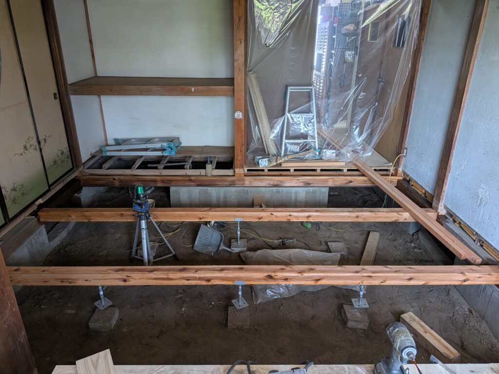 床下地の大引きを交換しました。床束も鋼製束にしてあります。