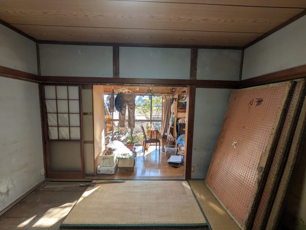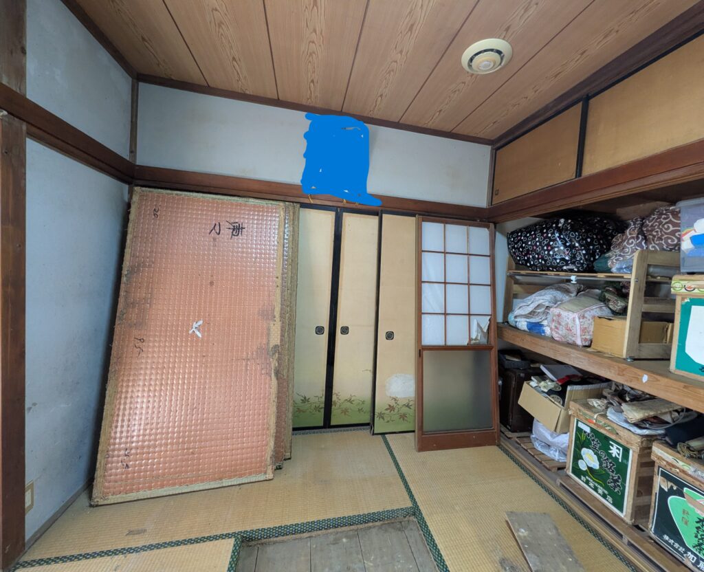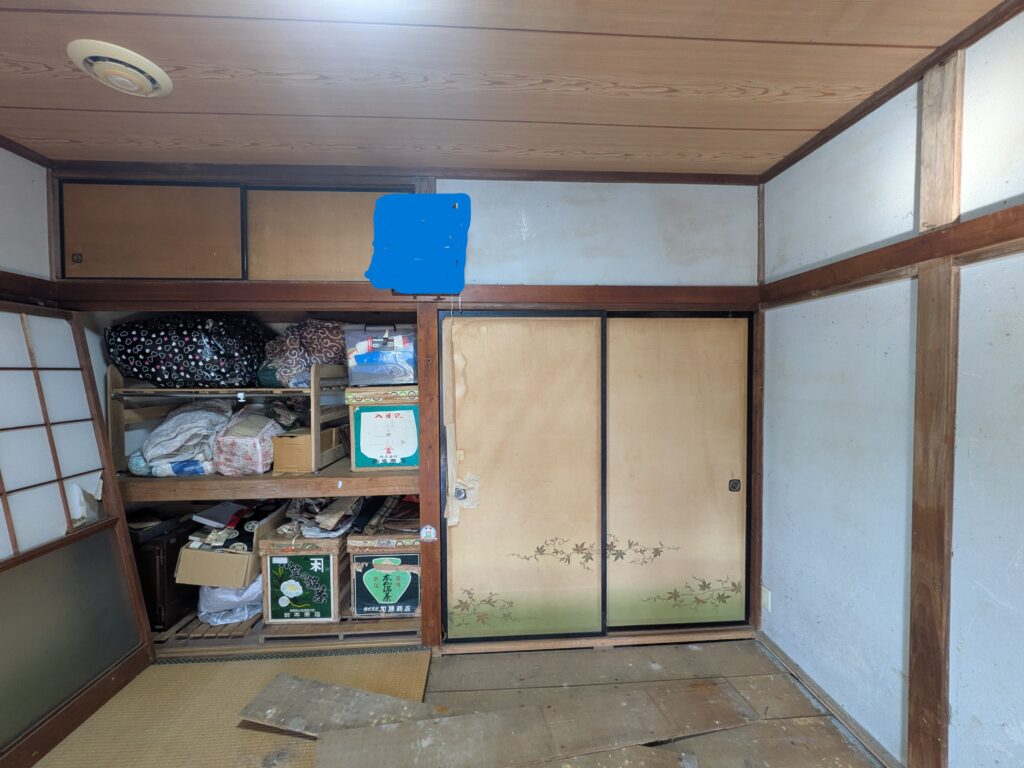 西面壁工事前状況です。正面の襖を撤去して壁にします。右側の押入れはクローゼットにします。