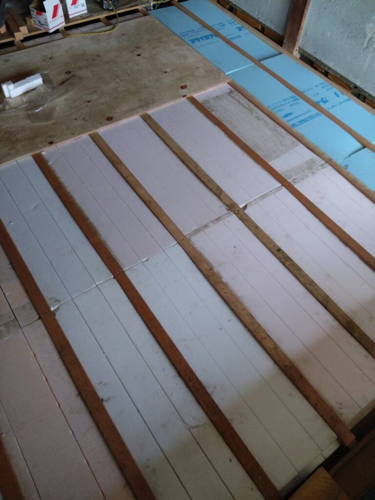 床断熱材を隙間なく敷き込みしてからベニヤ板を上に施工します。