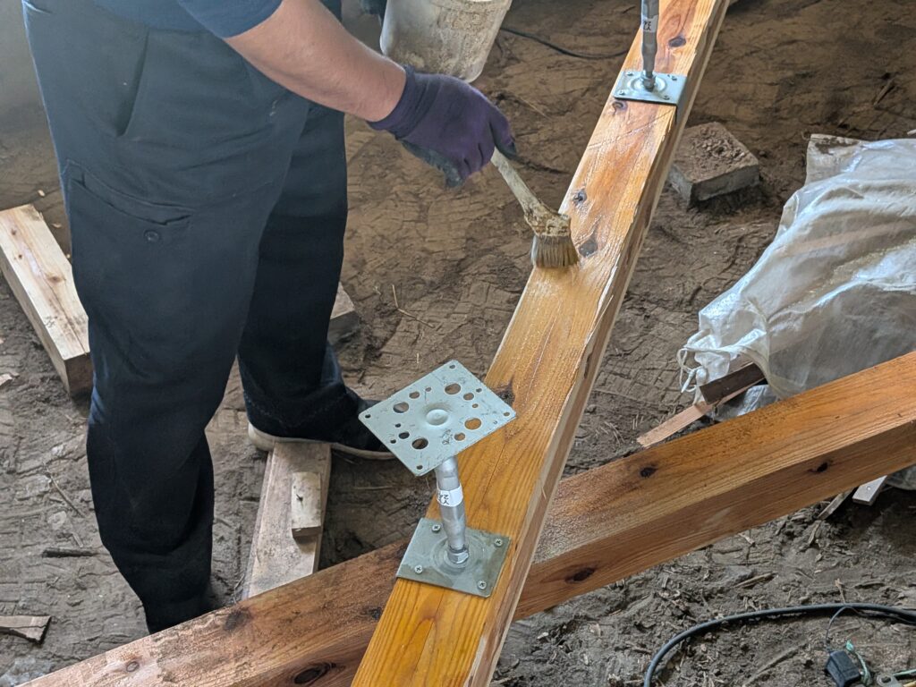 既存の土台にシロアリ処理の薬剤を塗っています。裏返しにして大引きの裏側にも薬剤を塗ります。先に鋼製束を固定してあります。