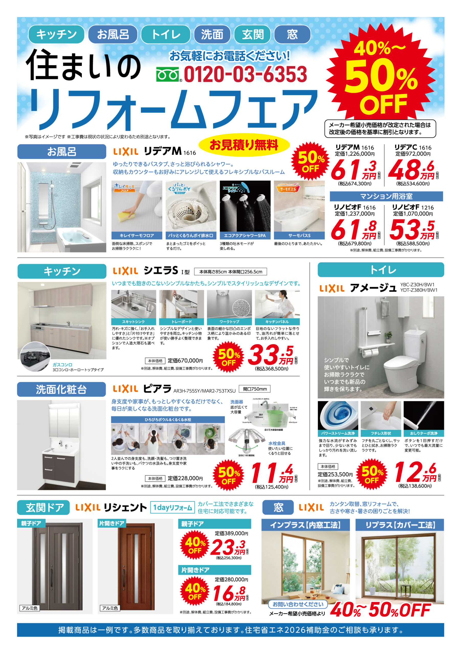 設備器具等もいろいろ多数のメーカーで対応していますが、リクシル商材を掲載しました。どのメーカーでも、またチラシ掲載以外の商材も当然対応できます。金額は現在の最新カタログ表示の定価で記載してありますが、定価改定があった場合は都度、変更対応致します。