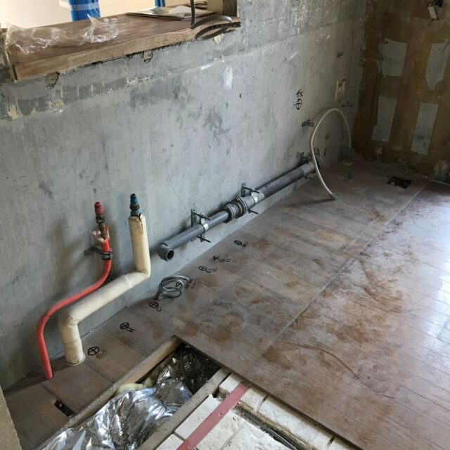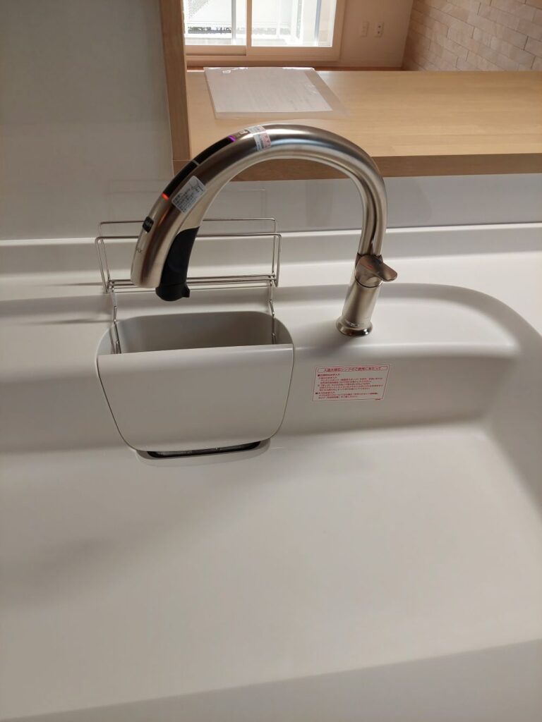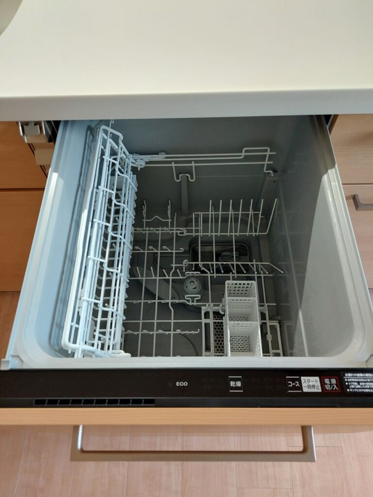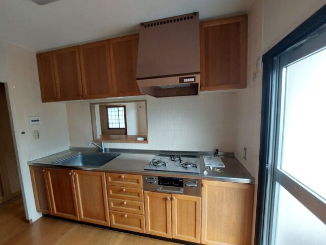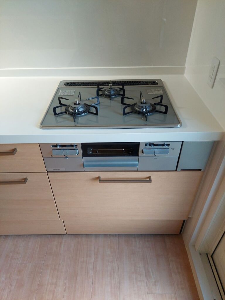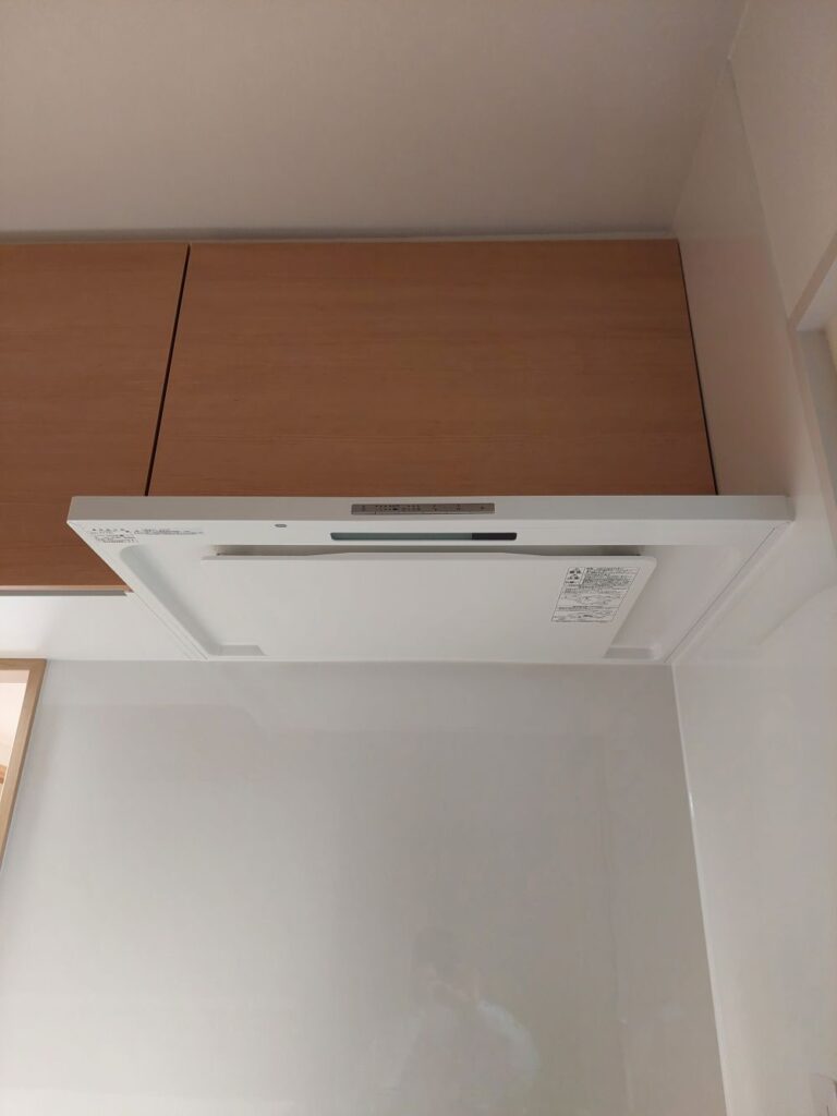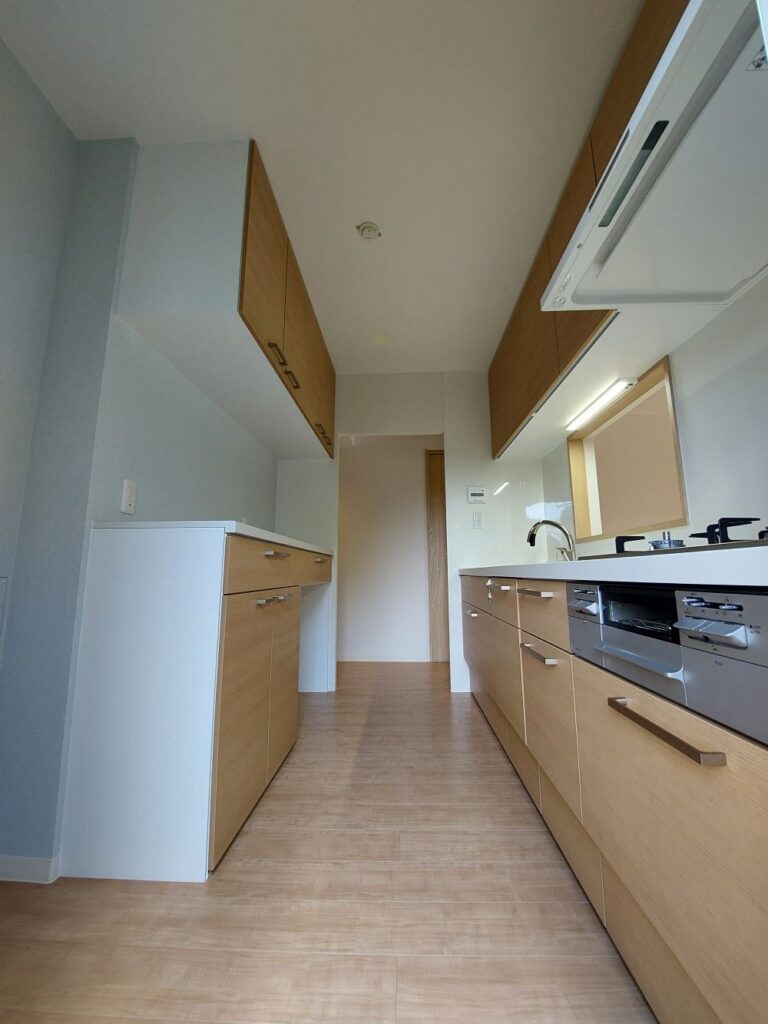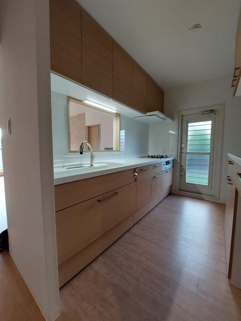 マンション対面キッチンを最新のキッチンに交換しました。ステンレスカウンターを人造大理石カウンターにして、食洗器を追加で設置し、高性能のレンジフード、壁タイルをキッチンパネルに変更しました。食器棚も同じ仕上げシリーズで合わせています。床や天井・壁の仕上げ材も新しくしました。奥に見える勝手口も断熱サッシ採風タイプドアに交換しました。
