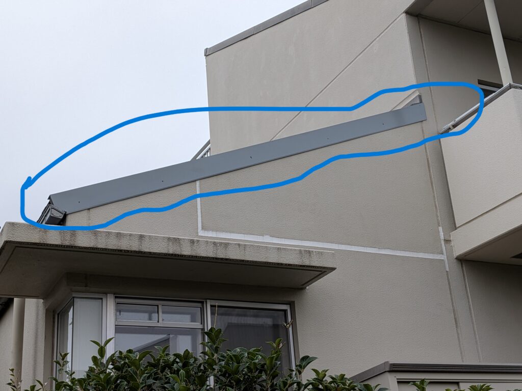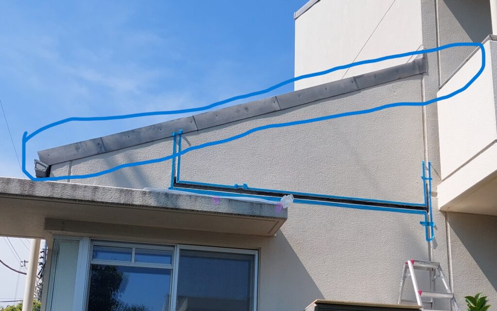 • 屋根板金塗装工事・・・本屋根は数年前にガルバリウム鋼板屋根を工事したので、今回は庇部分のみの板金屋根を塗装しました。塗装前の状況です。