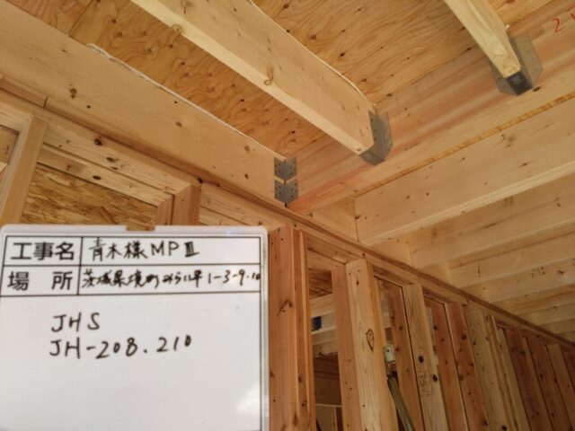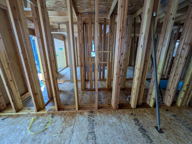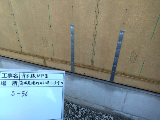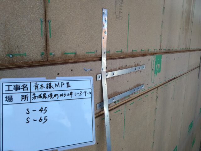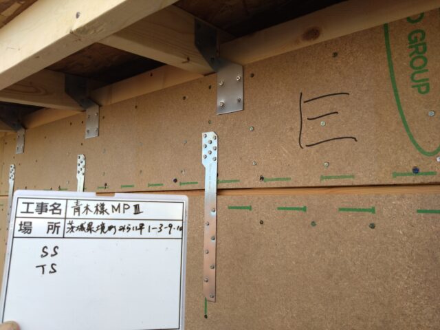 • 1階壁と2階壁との緊結(下部はまだビスが打たれていません)
