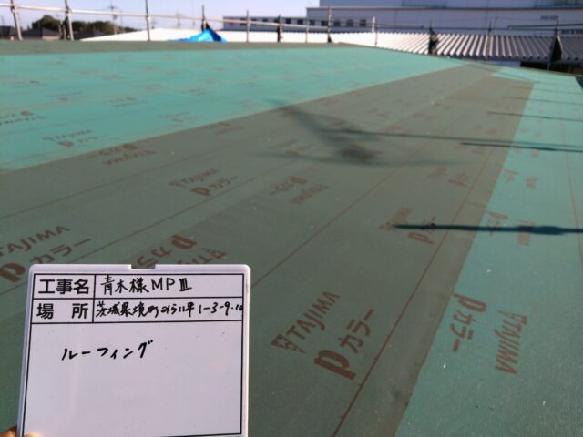 屋根下地ルーフィングを一面に施工したのち屋根の隅に下地材を入れます。