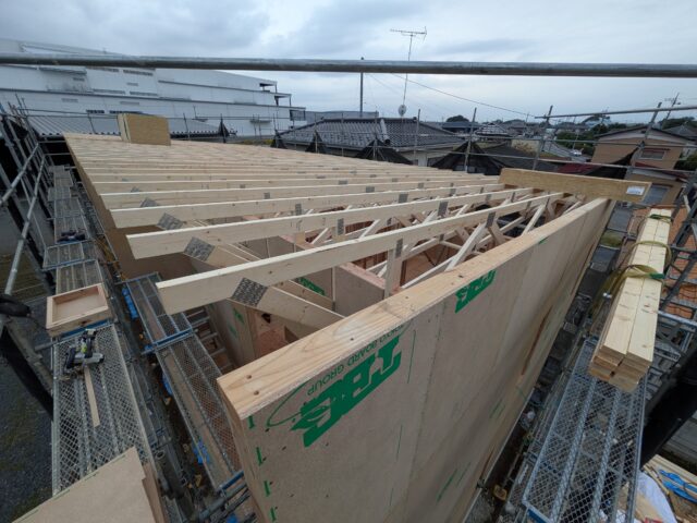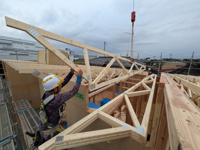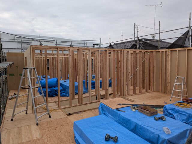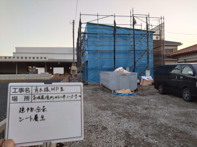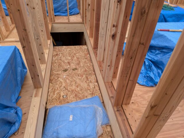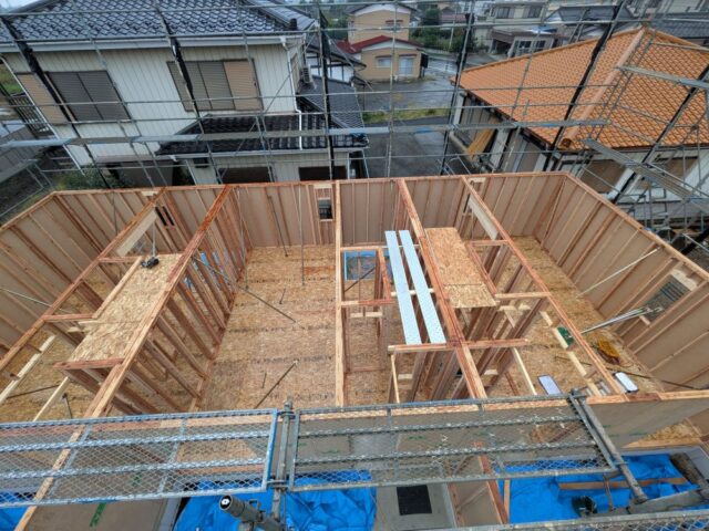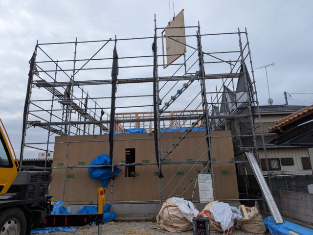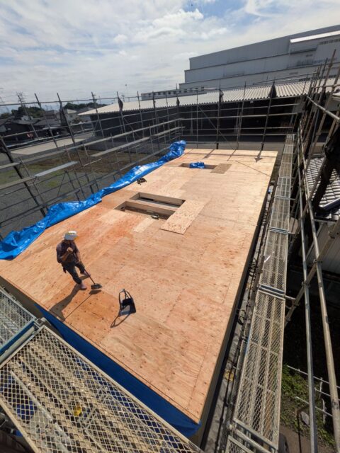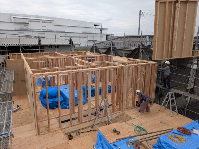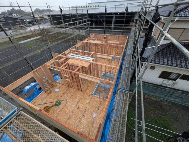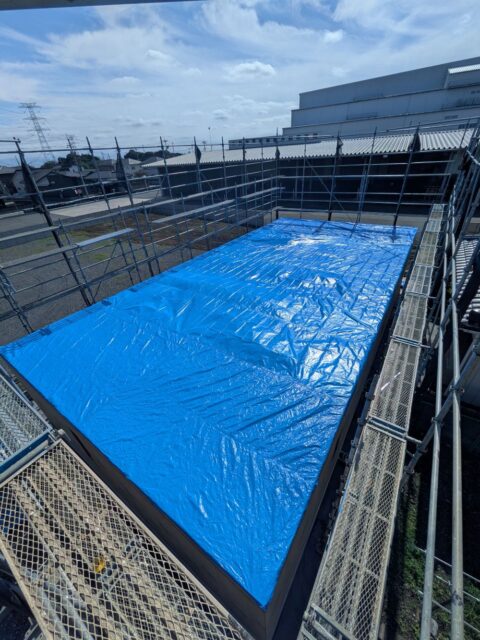 • 建て方が終わった後は雨養生の為ブルーシートで全体をカバーします。できるだけ雨に濡れないようにします。