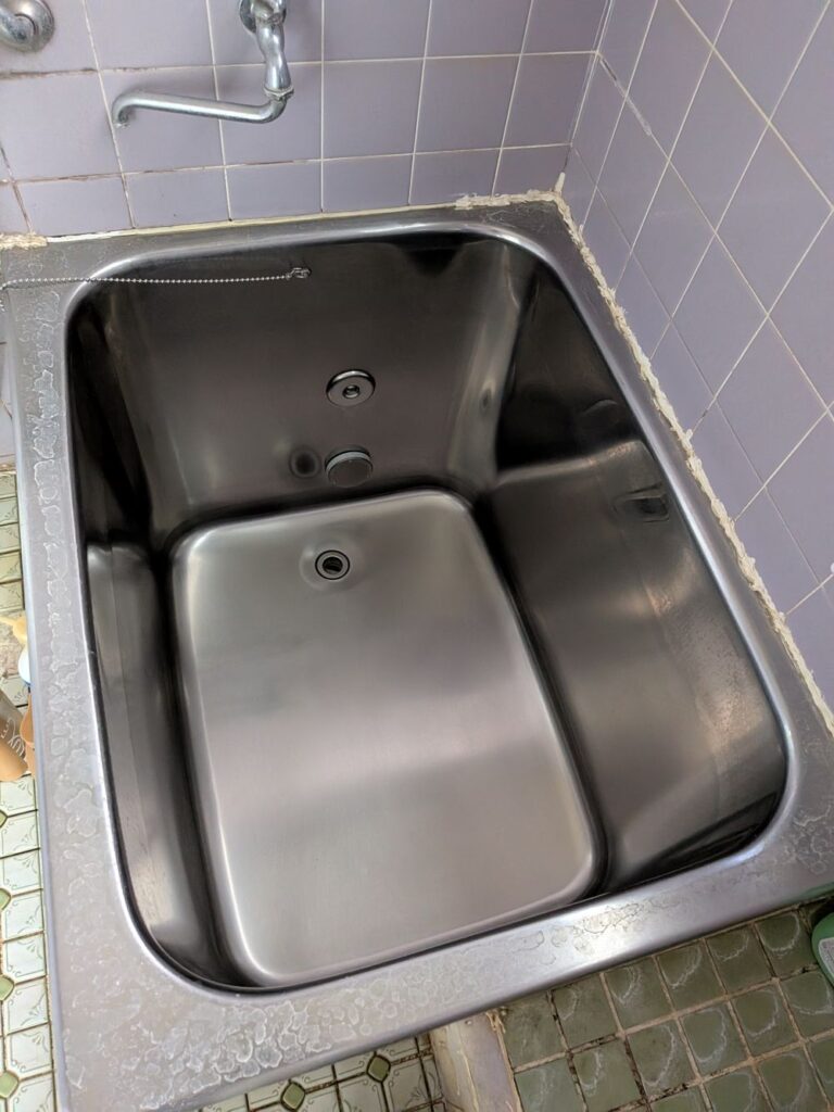 • ステンレスの浴槽ですが、改修後はユニットバスの高断熱浴槽になります。浴槽の裏側に断熱材が付いており、お湯が冷めにくい断熱性能が上がった浴槽になります。