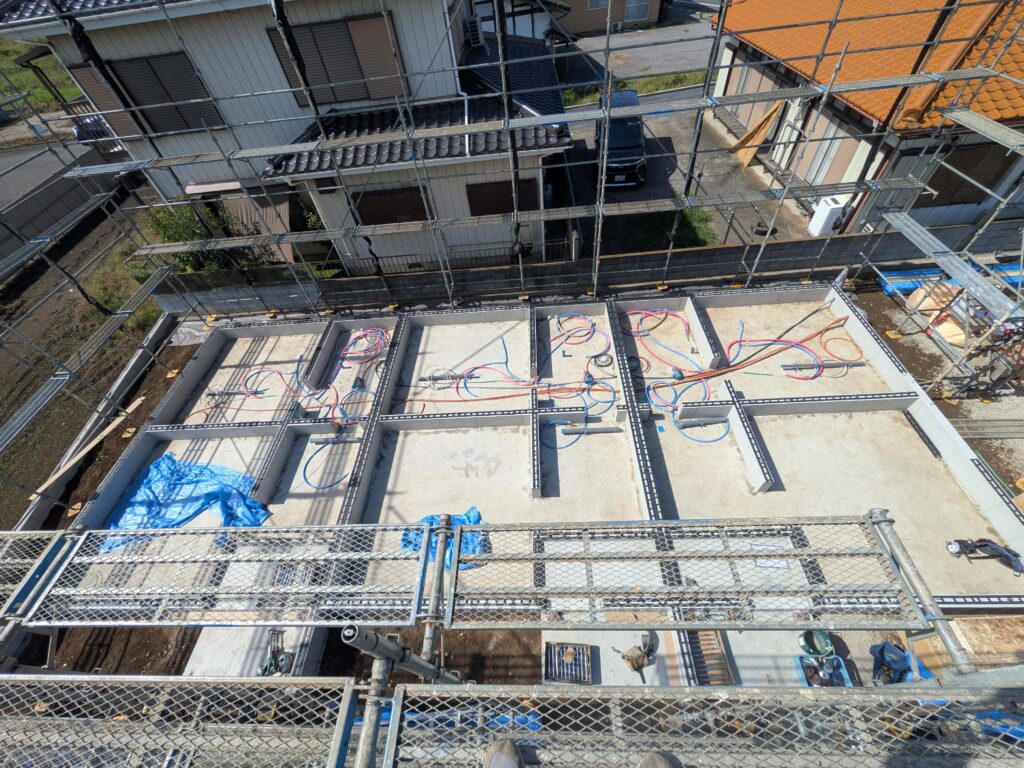 現場は基礎配筋工事が始まりました。台風の雨の影響で工事が数日できませんでしたが、本日は工事を行いました。