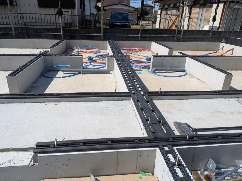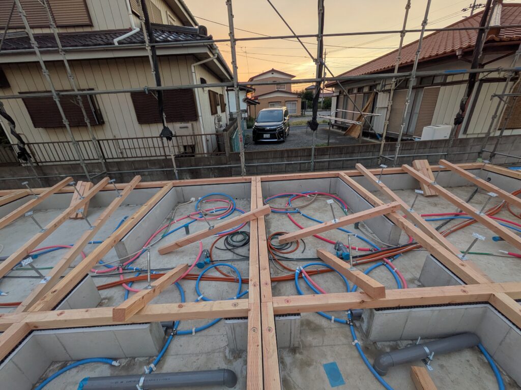 ここまで出来上がれば、建て方工事はできますので一安心です。先行内部設備配管・電気配線・ガス配管工事などを建て方前に行います。床下工事になりますので先行して行います。9月17日より土台工事開始です。9月24日には建物の形が分かるようになります。
