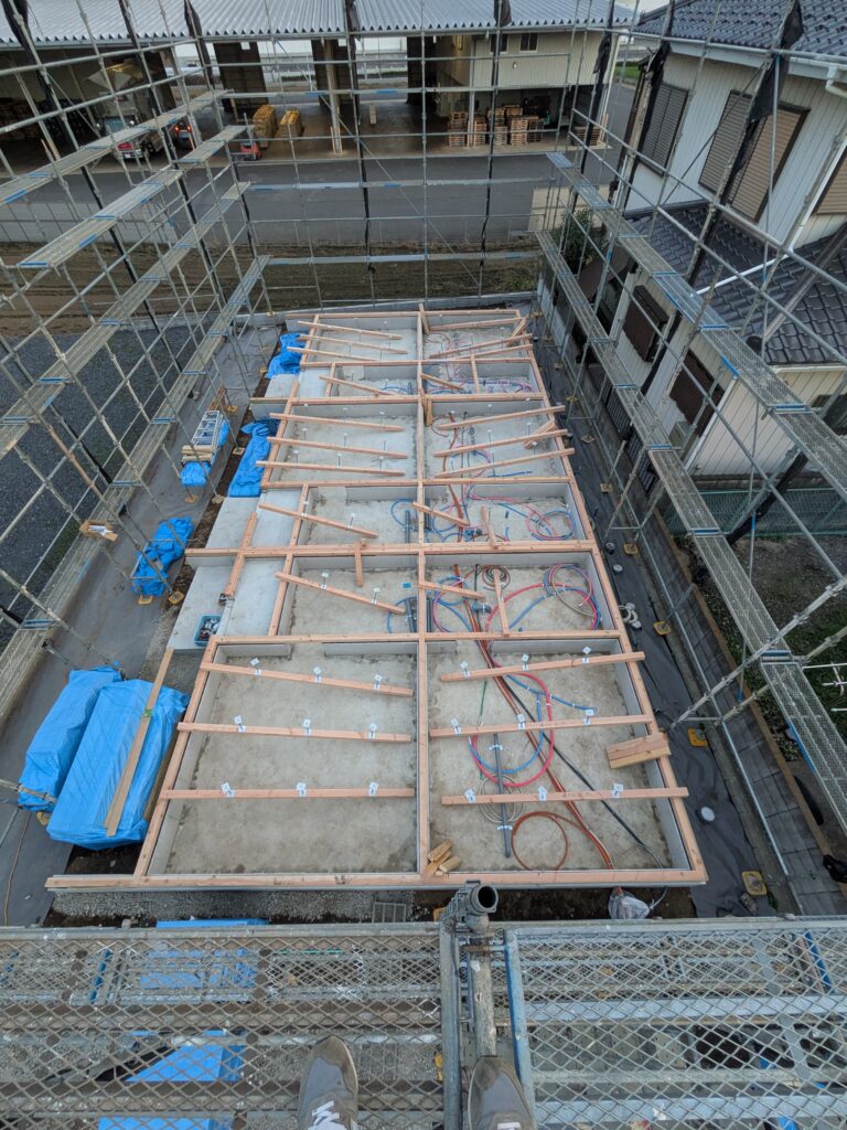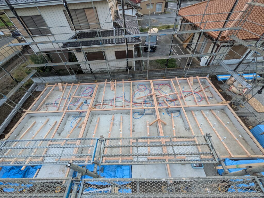 雨が続いており工事が進みませんが、土間コンクリートを天気予報を見ながら