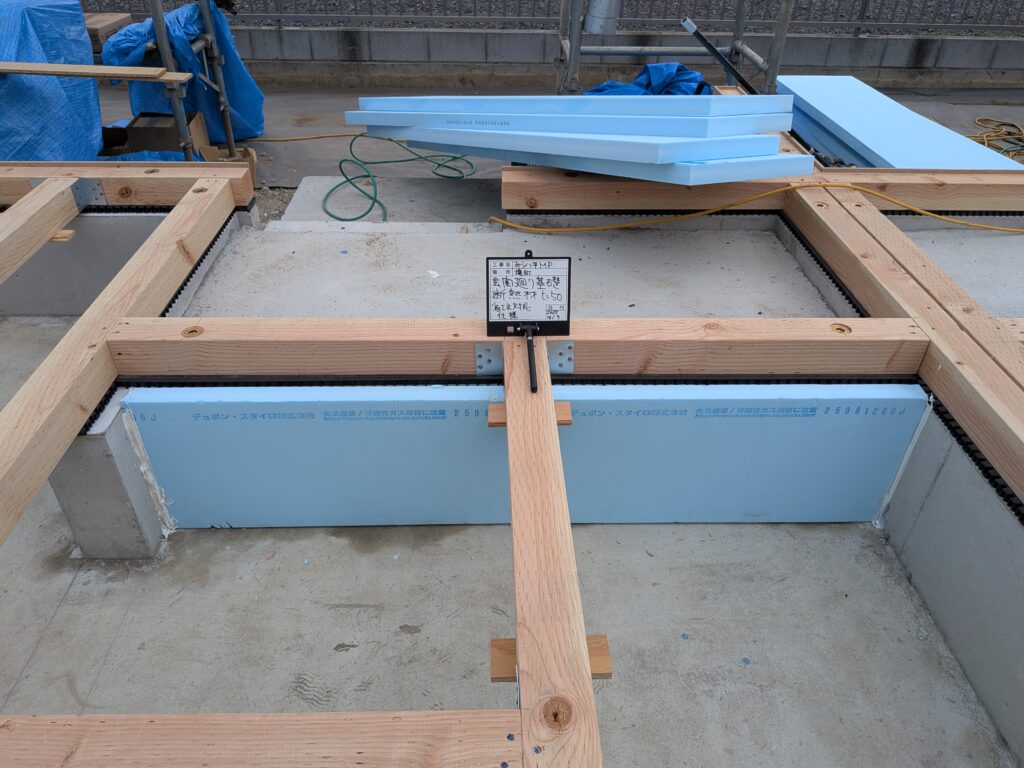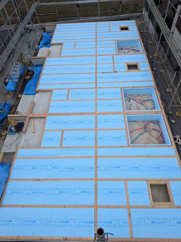 • 床下地を300mm間隔で入れて間に断熱材を敷き詰めます。床下からの隙間風も無くなり床自体が冷たくなることも無くなります。この上に12mmの下地ベニヤを貼って強い床にします。