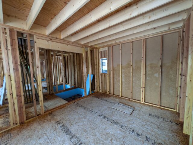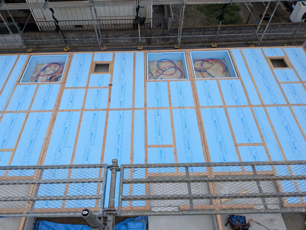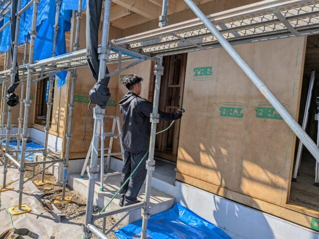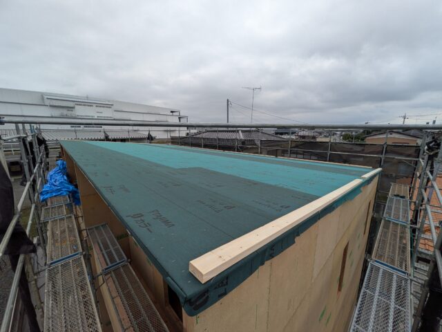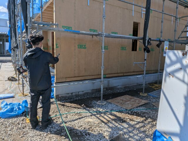 • 外壁工事:透湿シートを前面に貼り終えました。次は外壁のサイディング材を貼っていきます。