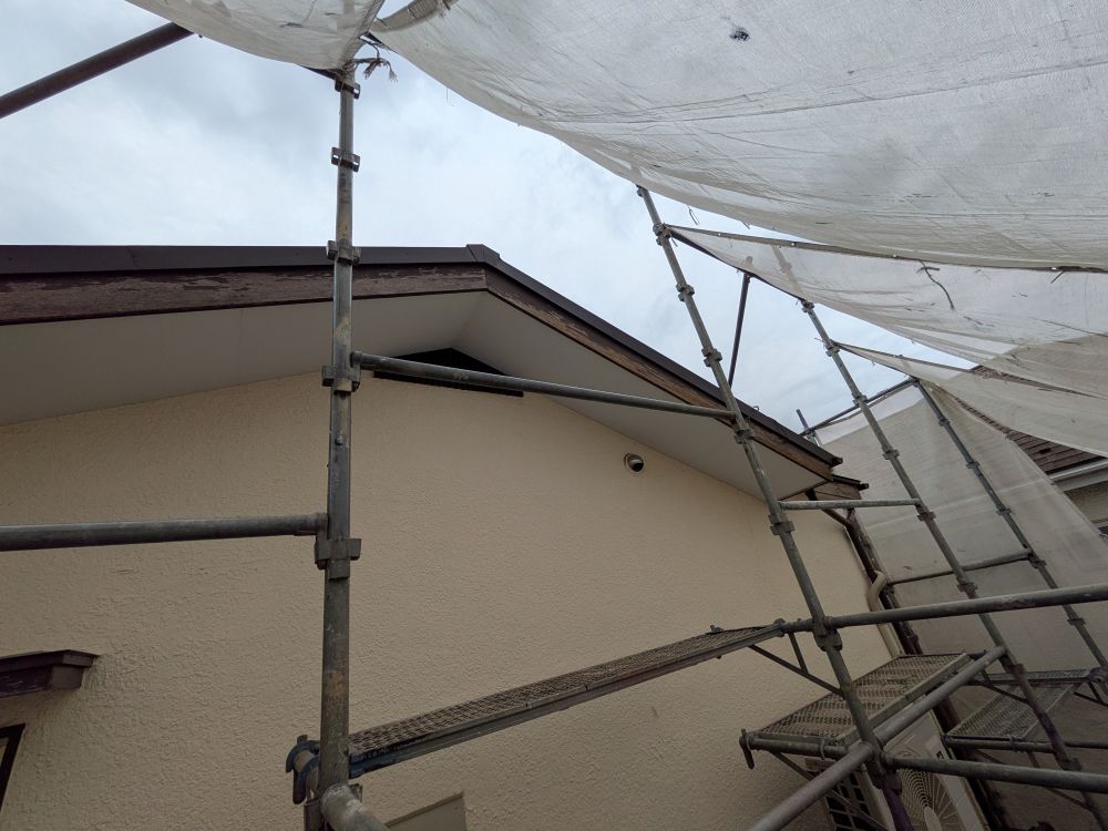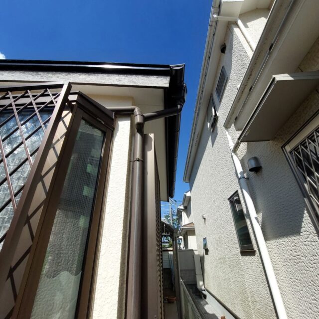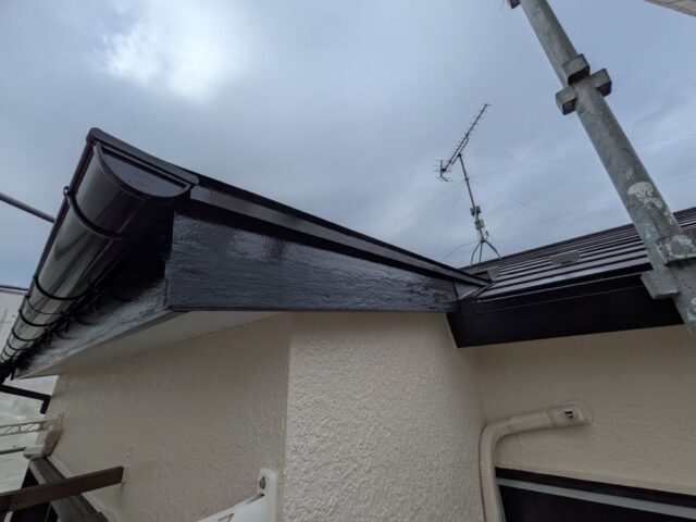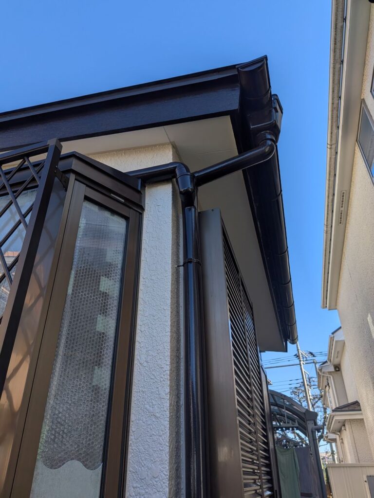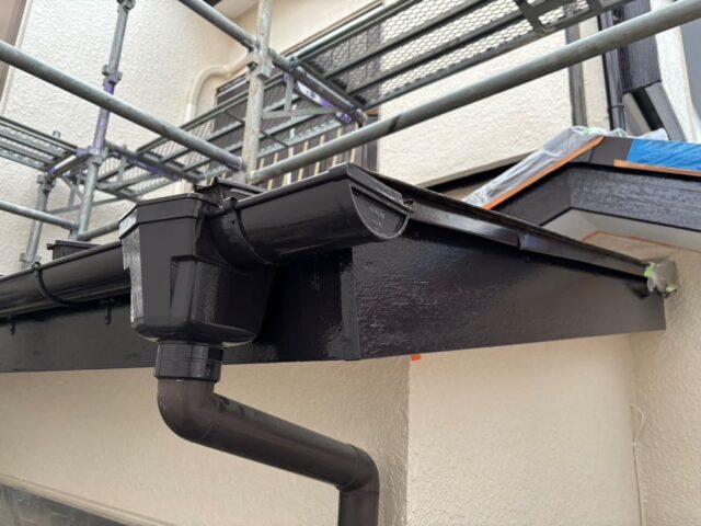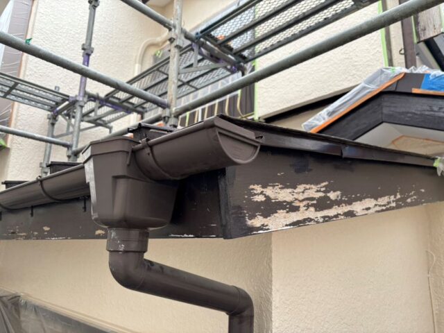 • 破風板と雨樋の塗装をします。雨樋も劣化で割れてきてしまう場合がありますので外壁塗装の時は雨樋も塗装します。