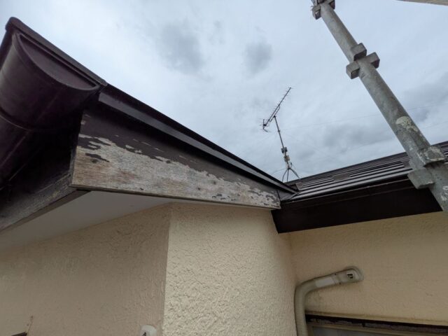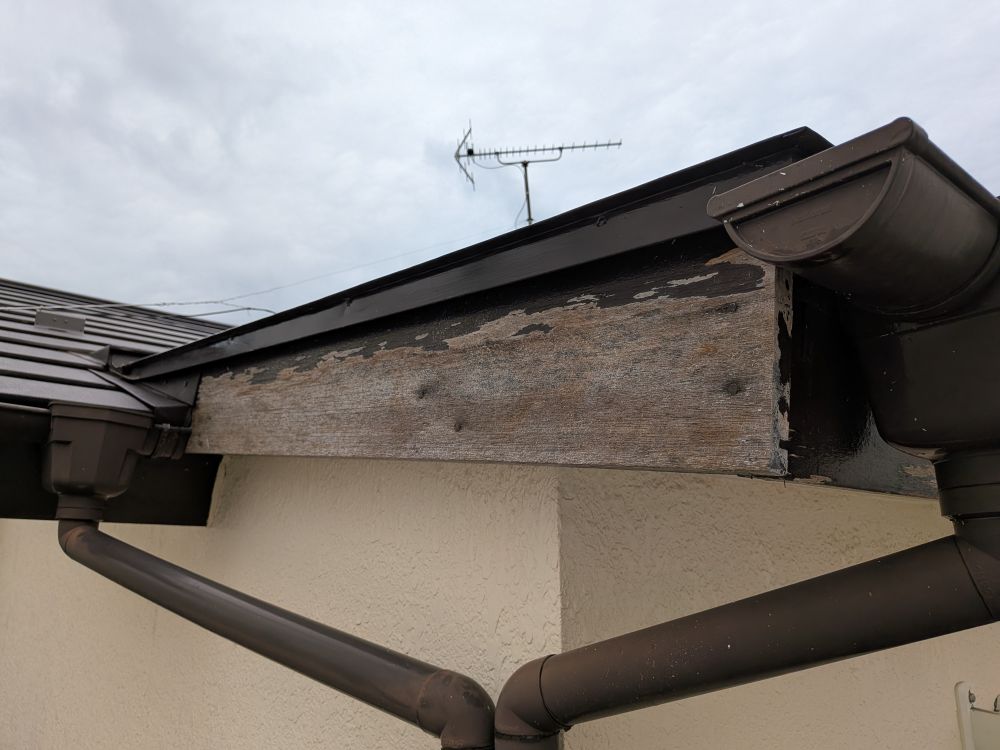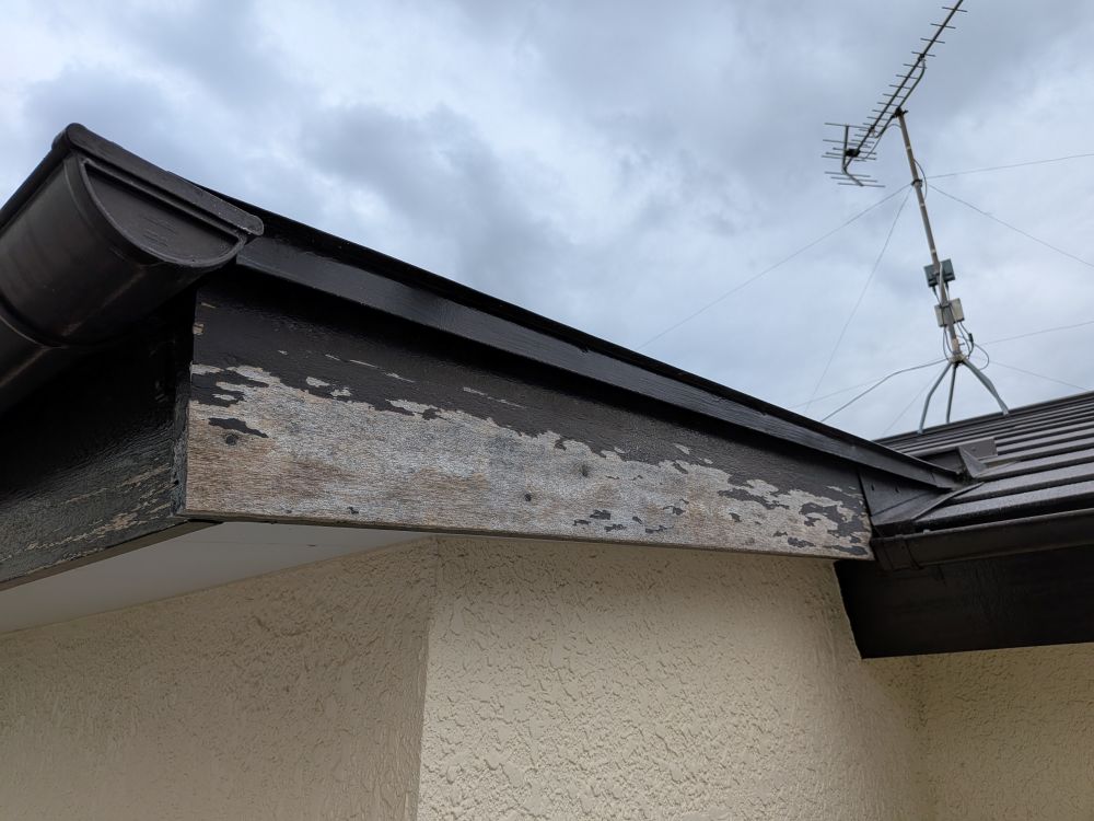• 破風板の塗装が剥がれて下地の木材が露出しています。雨が直接当たる場所は塗装が剥がれてしまうと木材の割れなどが起こりやすくなります。ほっておくと塗装もできない状況になる場合があります。