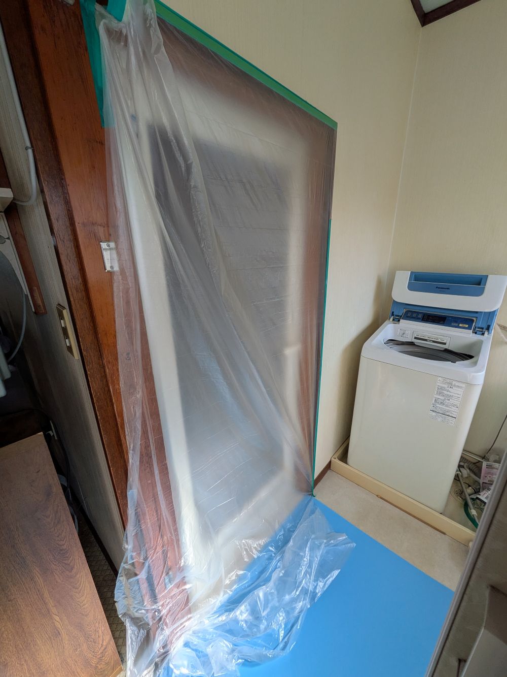 • 浴室の窓を外して、そこから解体したガラを外に出すようにし、入り口は人の出入りのみ使うようにビニールシートで養生します。脱衣所側にほこりが来ないようにします。