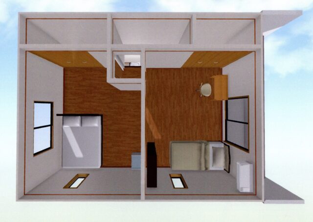 ベランダ天井の軒天もアクセントの外壁材と同じ外壁材で仕上げるので、その部分を修正しました。より一層完成のパースになりました。