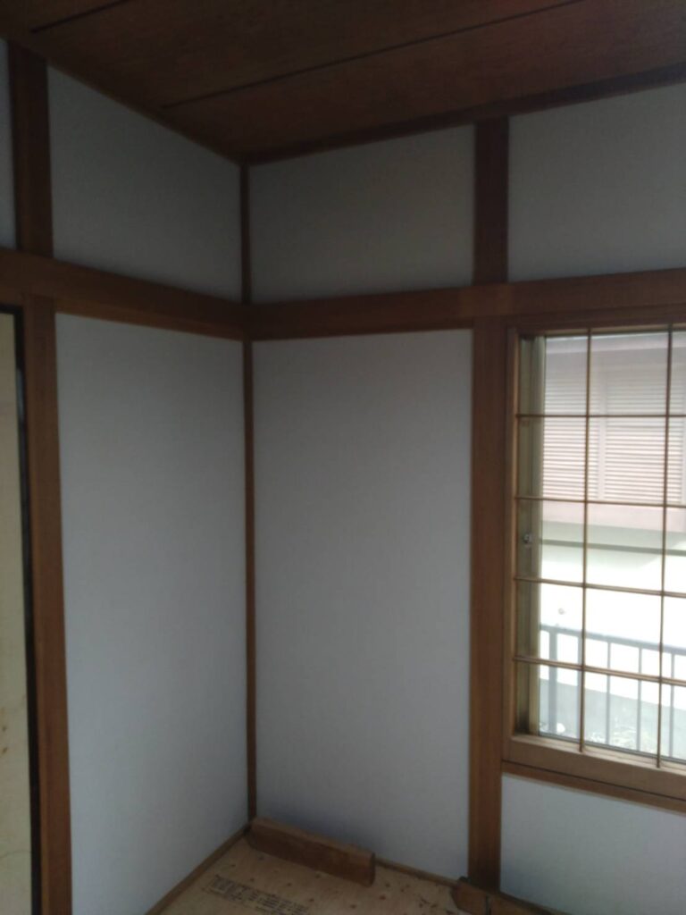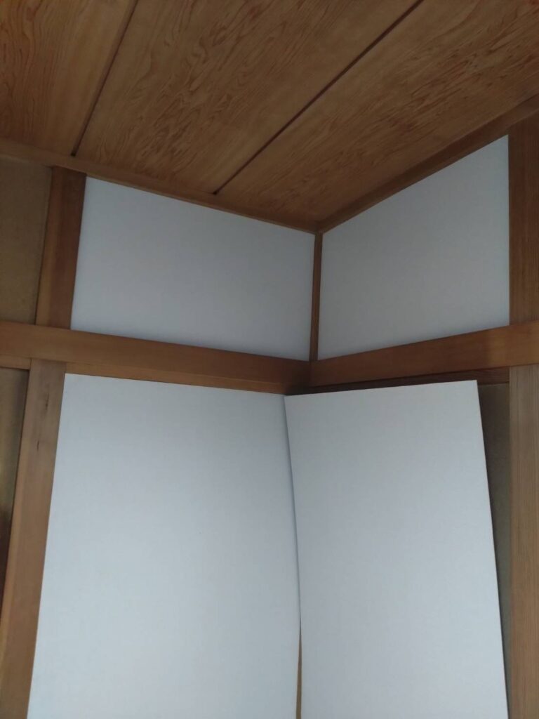 • 柱や長押に合わせて和室用化粧ボードをカットして貼っていきます。下地にボンドを塗り隠し釘で目立たないようにボードを貼っていきます。