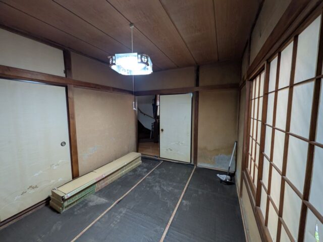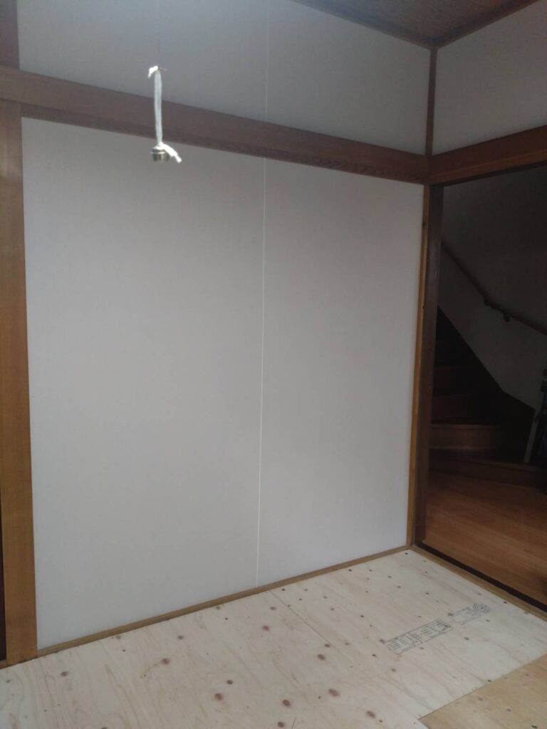 • 工事前です。畳をフローリングにします。柱や長押、枠材の木材のアク抜きをしてきれいにします。塗り壁も和室用化粧ボードを貼って壁も新しくします。