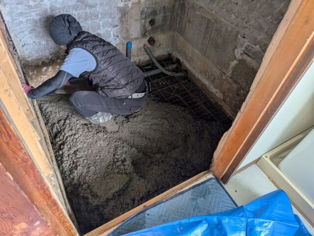 • 土間押さえ完了、きれいに押さえました。脱衣所の床から470㎜下げて土間を仕上げました。ユニットバスの脚で調整して脱衣所と同じ床レベルでユニットバスを設置します。