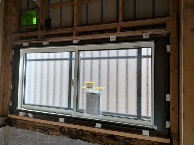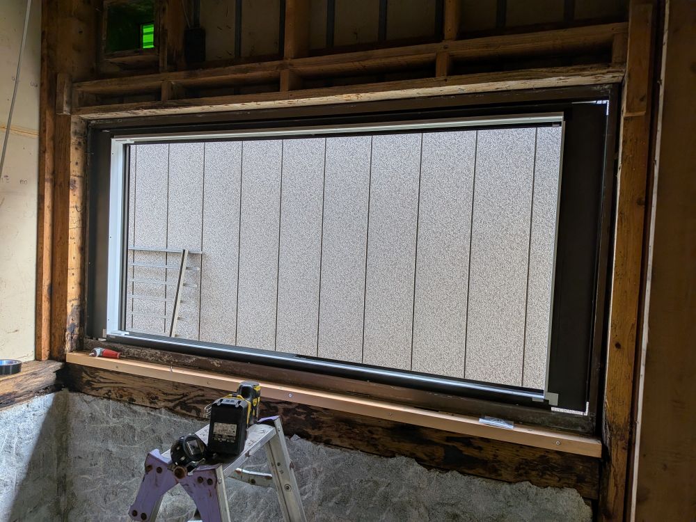 • 断熱窓が入りました。ユニットバスの幅に合わせて窓枠に調整部材を入れてワイドを調整しています。以前の窓は幅が広くてユニットバスの壁の内側に収まらなかったので小さくしました。