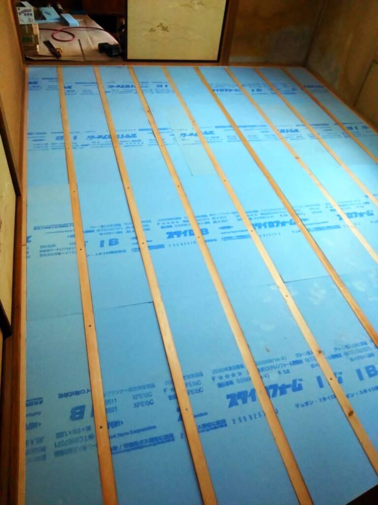 • 床仕上げのフローリングの下にも12mmの下地ベニヤを貼ります。もう床がしなる事も無くなります。床暖房にも対応している床材を貼っていきます。