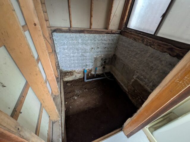 • 浴室の解体工事終了しました。ユニットバスを設置するのに土間コンクリートを打設しますので、ある程度まで浴室内の土を搬出して高さを合わせます。次の工程は設備業者さんに排水管のやり直し工事をしてもらい、その後、土間コンクリート下地の砕石を入れてコンクリート打設の準備をします。解体後、一部、土台や柱が弱っていますので補強工事を大工さんにしてもらいます。シロアリ処理も行います。
