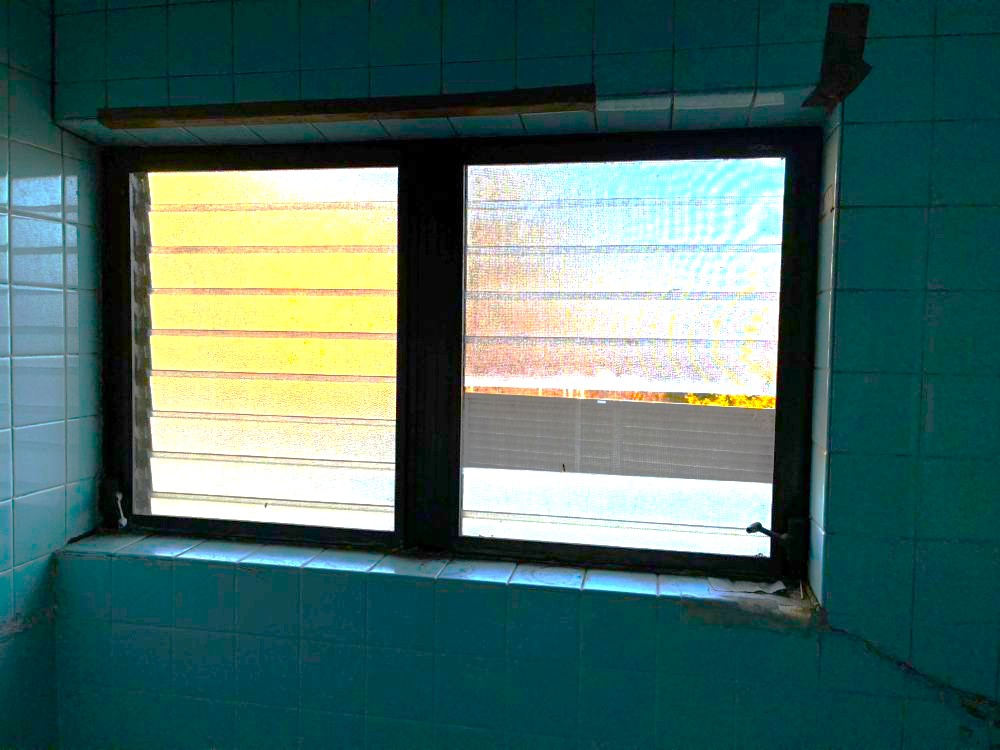 既存キッチン・・・タイル壁をキッチンパネルに交換します。窓台のステンレスも同じパ ネルに変更します